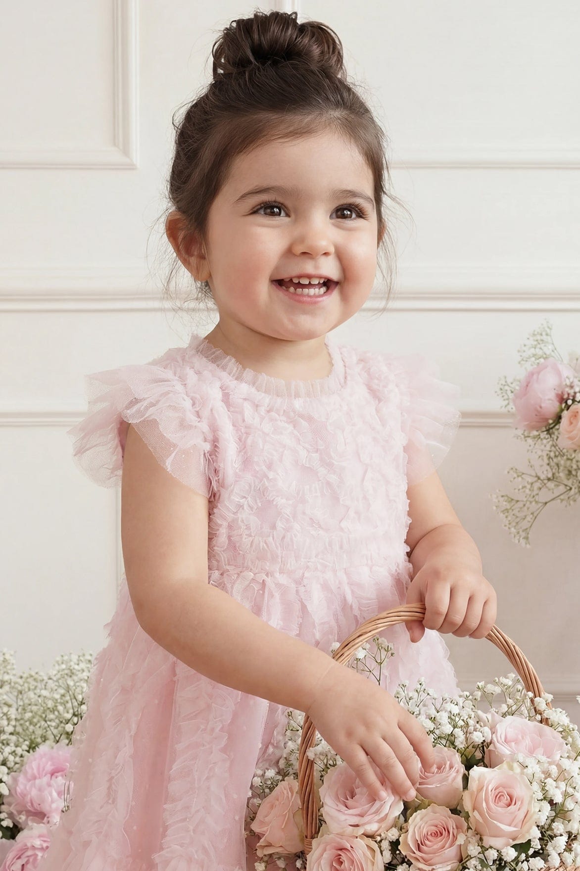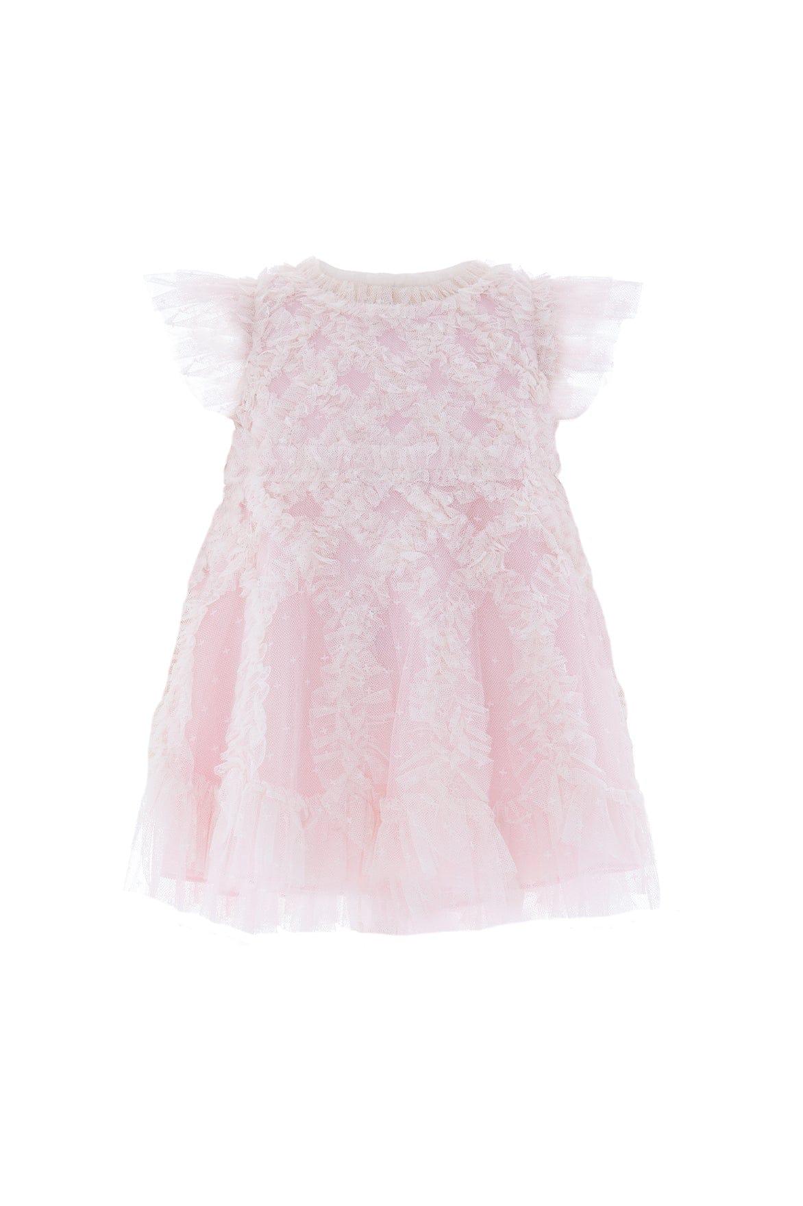 The Rosella Baby Dress in Peony Pink/Cream. This dress features intricate cross-hatch frill detailing on the bodice, cascading into playful scalloped edges at the hem. Designed with contrast-colour frills and signature Needle & Thread touches at the neckline, waist, and shoulders adds whimsical charm. Finished with soft, layered tulle sleeves and fully lined in gentle cotton voile for all-day comfort. Complete with coordinating cotton dobby bloomers, edged in delicate frills. A timeless statement piece your little one will cherish forever.