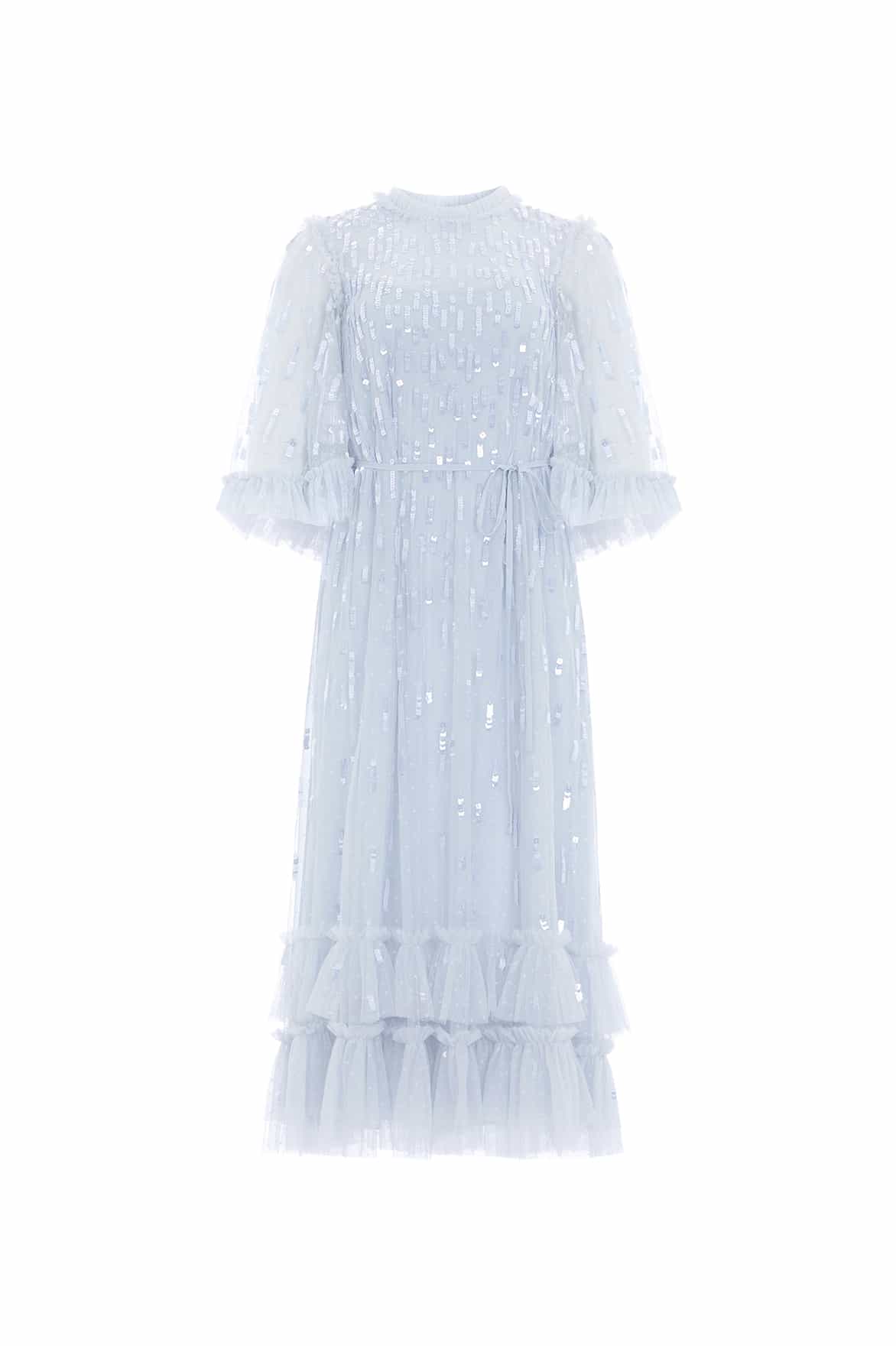 The Sequin Dash Ballerina Dress in Cloud. This ballerina length dress is adorned with statement, square sequins in a staggered linear layout creating a shimmer throughout. Developed with a loose silhouette for an effortless, floaty feel featuring voluminous sleeves for a romantic look. The perfect dress for an upcoming special occasion.
