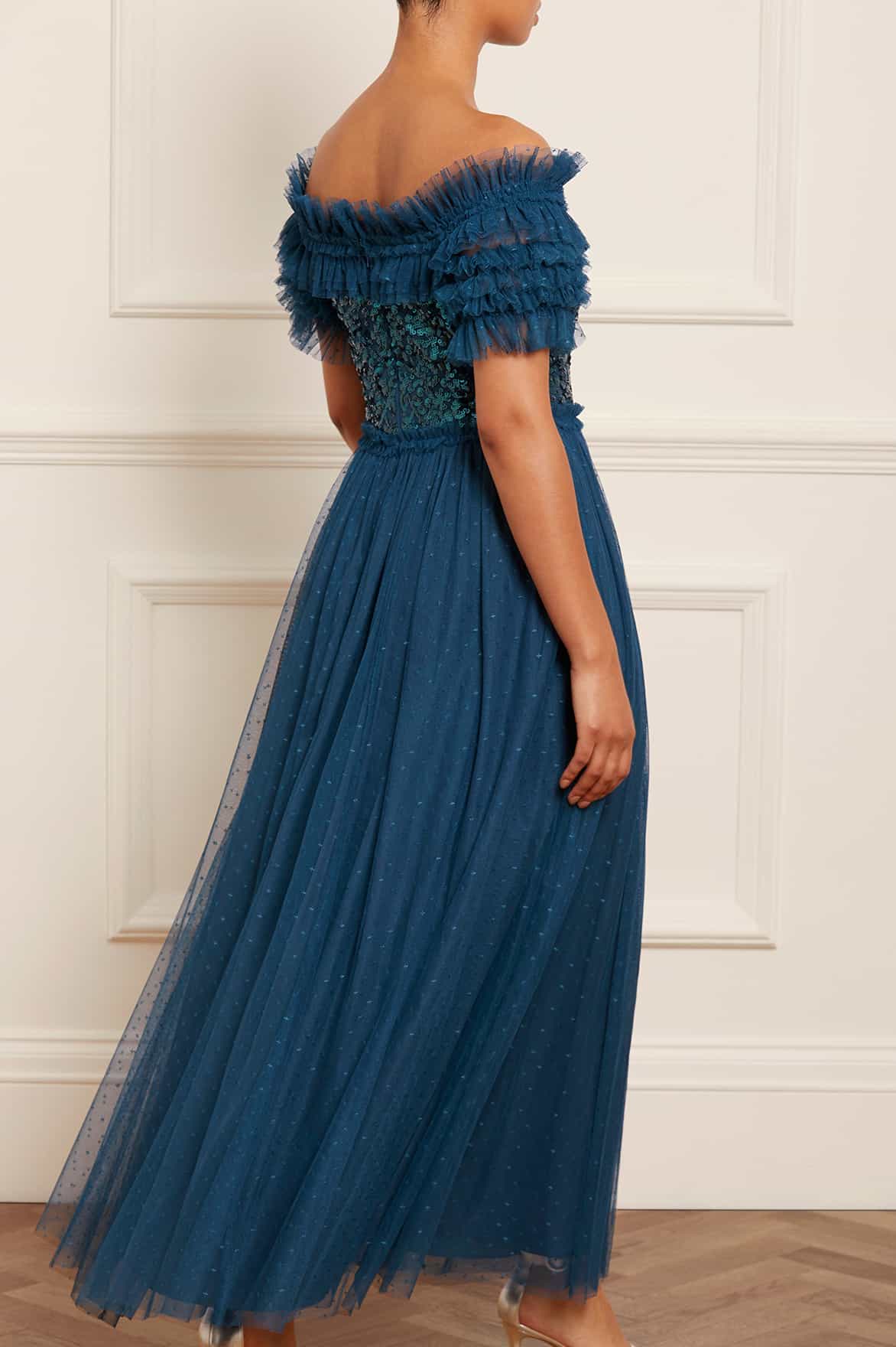 The Sequin Wreath Bodice Off-Shoulder Ankle Gown in Teal. This beautiful gown is crafted with an iconic off-the-shoulder design. Adorned with layers of delicate ruffles, along with an elasticated panel for comfort and hold. The bodice is beautifully decorated with shimmering sequins inspired by a vintage lace curtain. Designed with a romantic layered tulle skirt for signature Needle & Thread styling. A perfect gown for a special occasion.