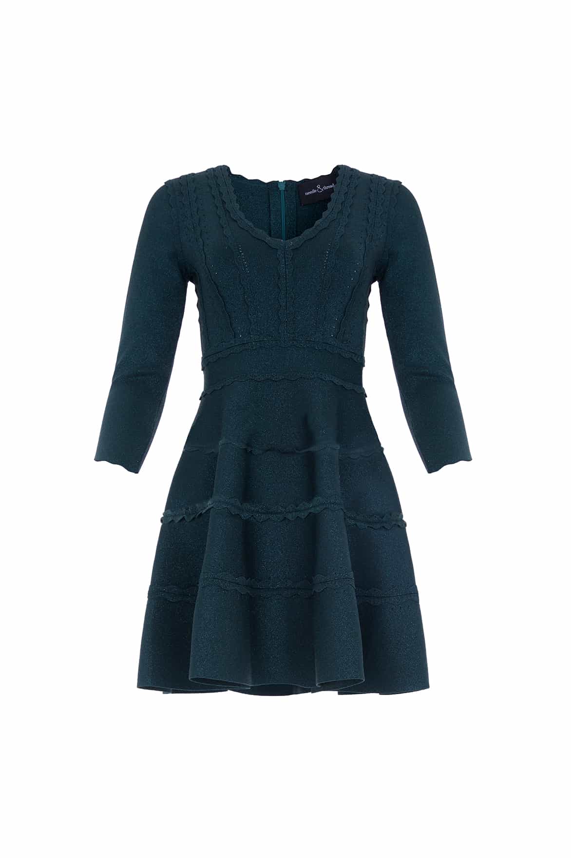The Shimmer Knit Mini Dress in Emerald. This mini dress is designed with a shimmer knit fabric inspired by vintage textiles. Crafted intricately with knitted scallop trims for signature Needle & Thread detailing. Developed from a responsibly sourced stretch viscose, twisted with tonal lurex for a delicate subtle shimmer. Designed with a fitted bodice and V-neckline for a flattering silhouette. The perfect dress to take you from day to night.