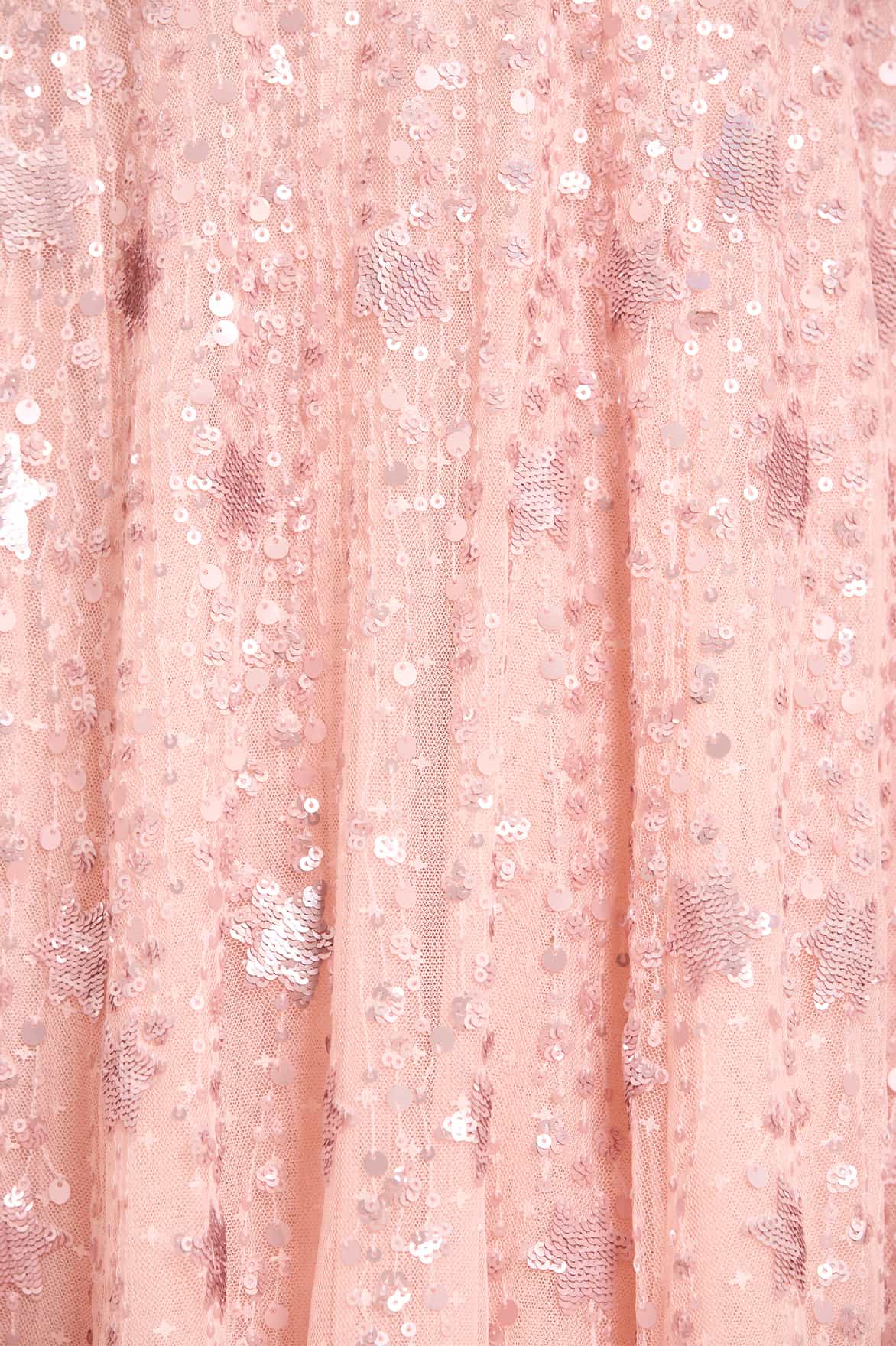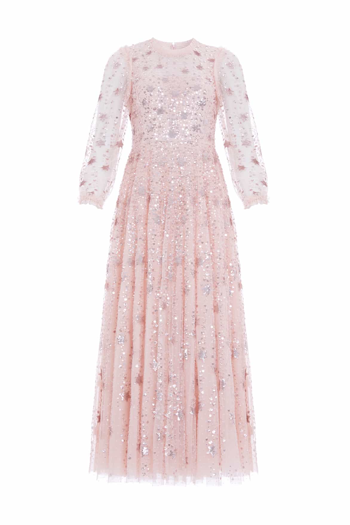 The Shooting Stars Long Sleeve Ankle Gown in Petal Pink/Rose Gold. Beautifully adorned with shimmering embellishments of intricate star motifs, with clusters of tiny sparkling sequins that scatter towards the hem, create a captivating effect. Inspired by the extravagant costumes worn by the Follie’s dancers of the early 1900s, this romantic gown features blouson sleeves adorned with glittering celestial motifs in countless tiny sequins, complemented by signature Needle & Thread tulle frills. The skirt boasts generous layers of net and tulle, culminating in a sweeping hemline. This gown captures the magic of fairytales and the beauty of the night sky.