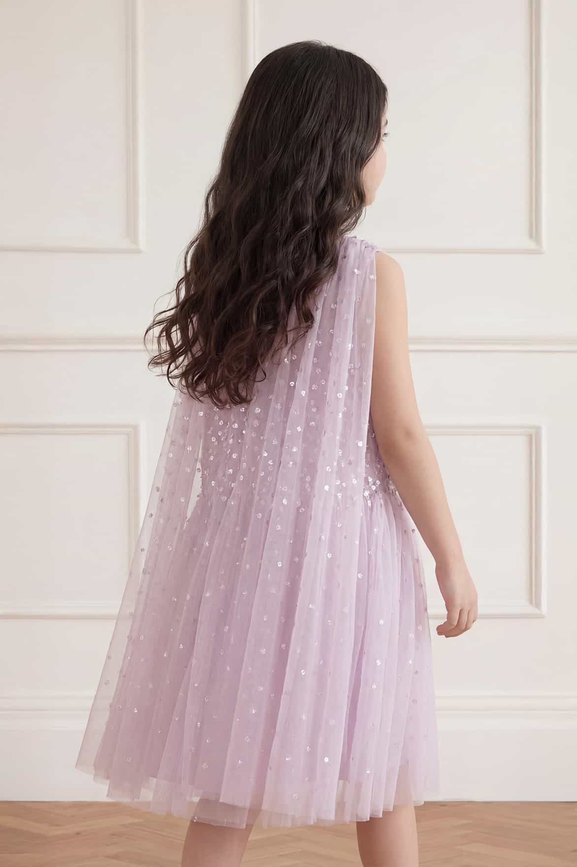 NEW SEASON. The Sunrise Sequin Cape Kids Dress in Powder Lilac. This enchanting kids dress is adorned with softly shimmering sequin dots arranged in gentle linear bands for a luminous effect. Designed with a relaxed fit, flowing cape detail and full skirt, it creates graceful movement. Perfect for a party moment.