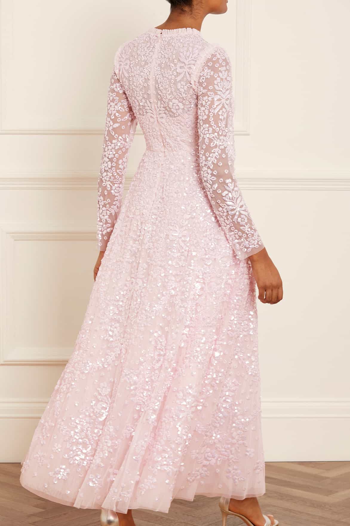 The Victorian Wreath Gloss Long Sleeve Gown in Peony Pink. This gown takes inspiration from Victorian panelling details. Beautifully adorned with an intricate sequin artwork featuring floral and bow motifs in a repeated wreath layout. Needle & Thread have sourced special sequins with extra foil coating to create an ultra high shine look. This gown is perfect for an upcoming special day.