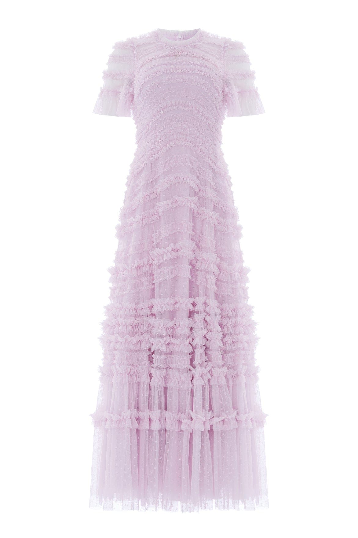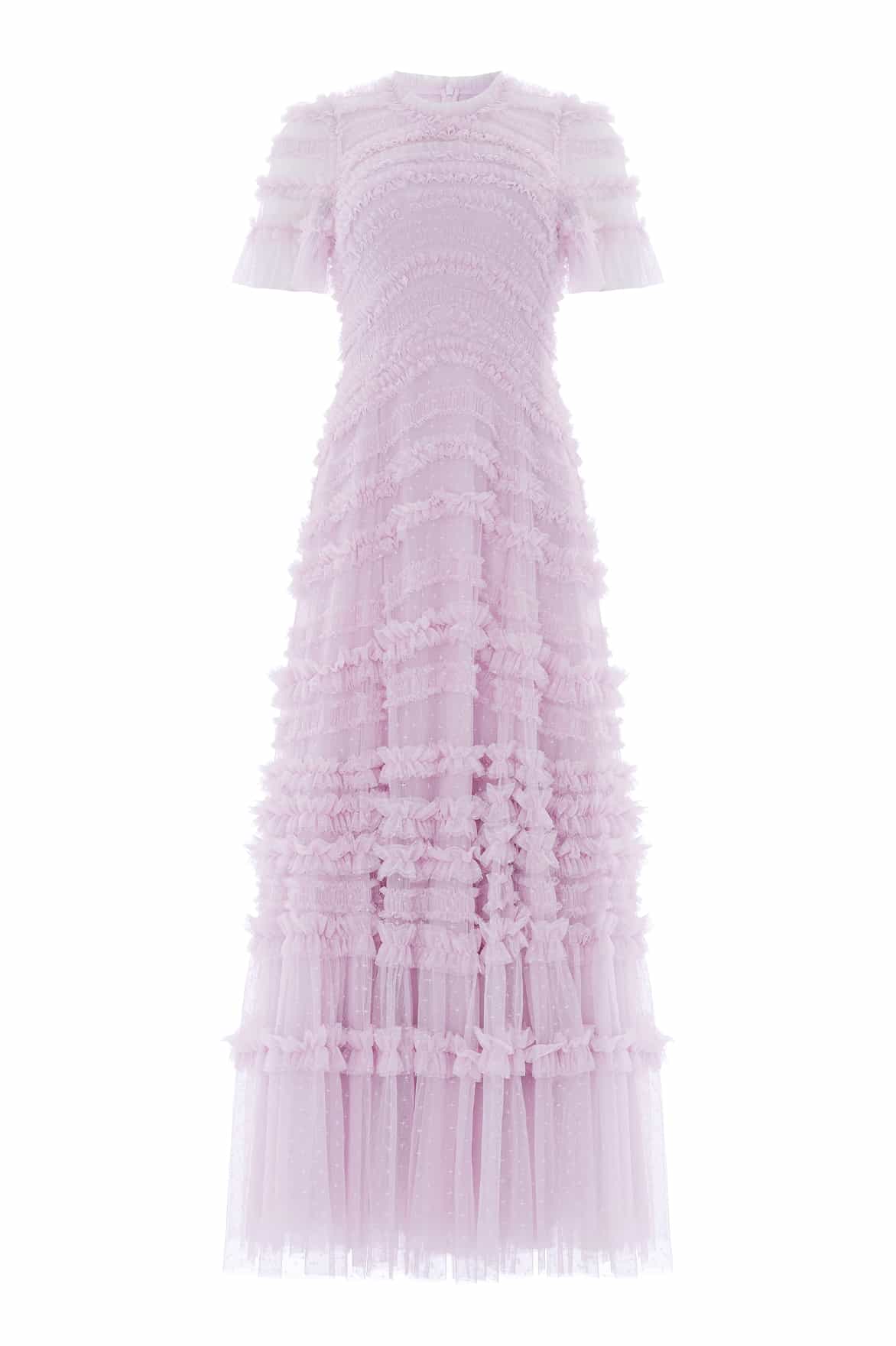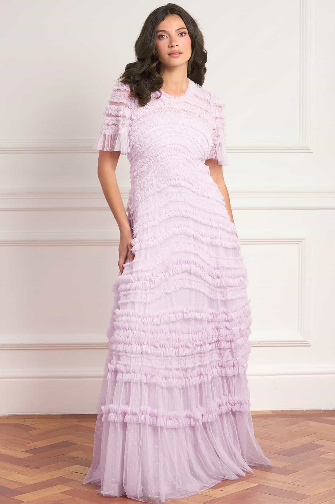 NEW SEASON. The Amara Round Neck Ruffle Gown in Powder Lilac. Inspired by romantic English gardens, this gown features softly curved ruffle bands flowing across the bodice for gentle movement and texture. Finished with a round neckline and a fluid full-length skirt, creating an elegant and timeless silhouette.