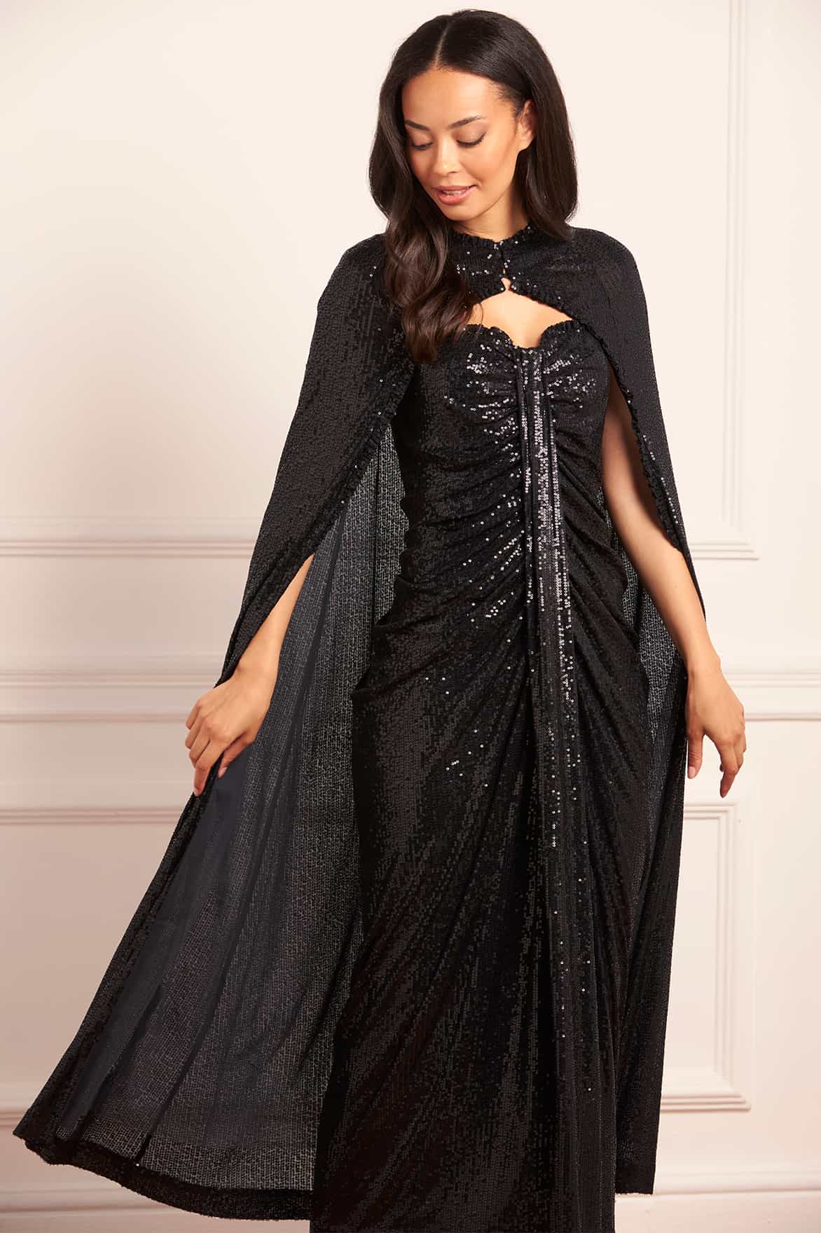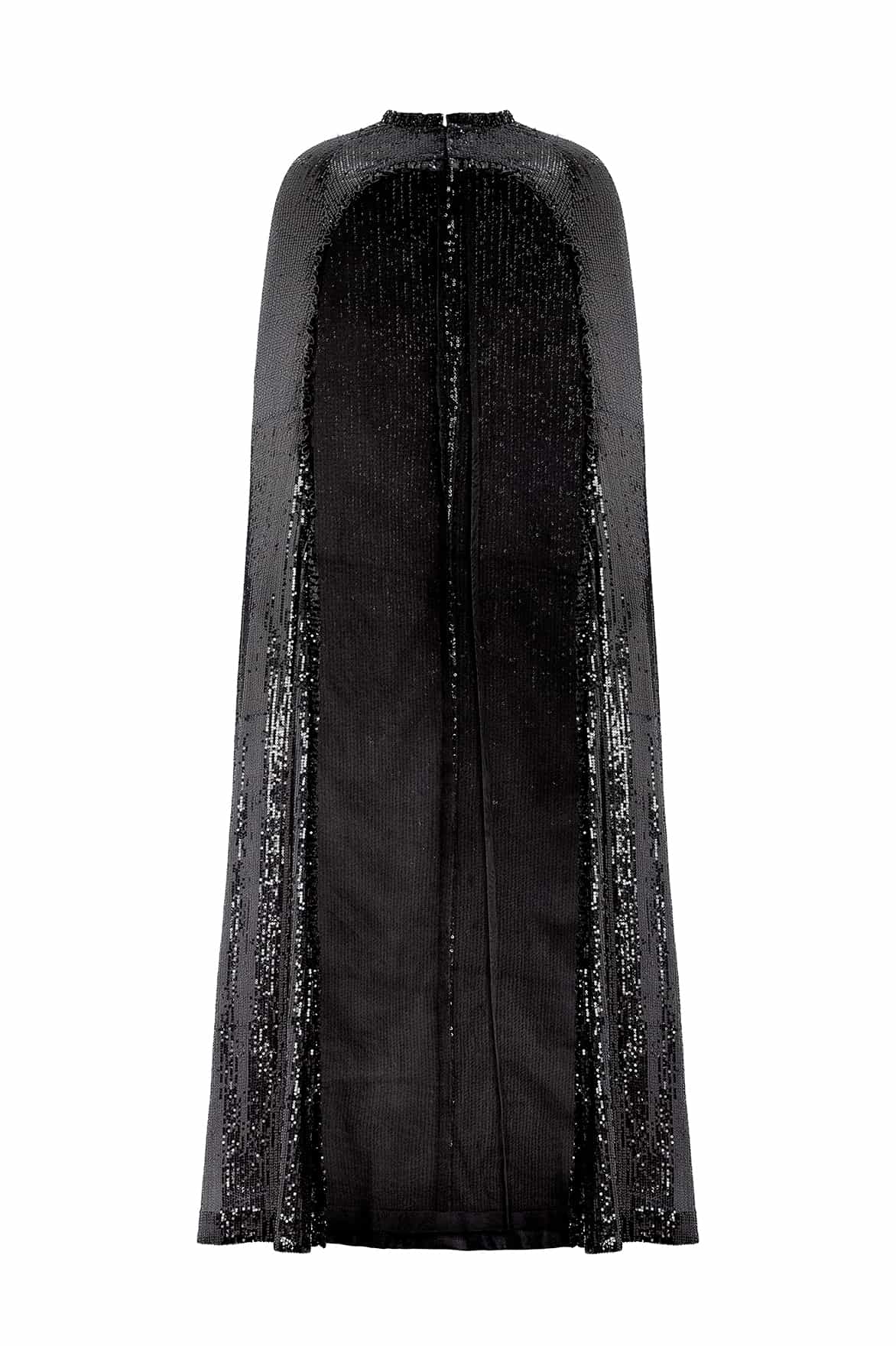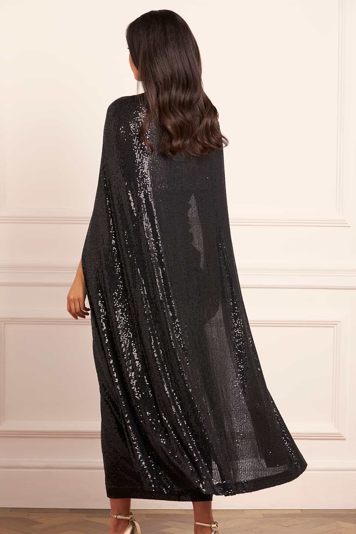 NEW SEASON. Amora Long Cape in Graphite. Sequins shimmer across graphite tulle, scattered like constellations against night skies. The flowing silhouette drapes gracefully over the shoulders, creating drama and movement. A versatile piece to layer over evening gowns, offering both elegance and celestial drama.
