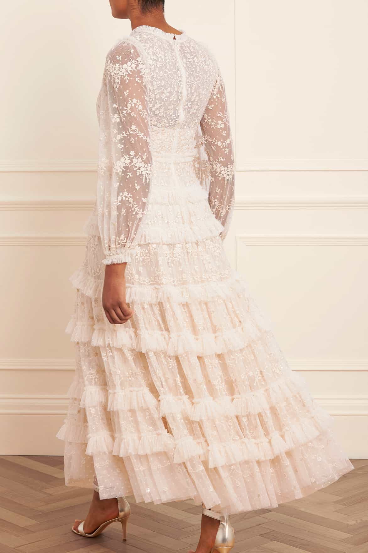 The Blossom Lace Ankle Gown in Cream. Designed with a voluminous silhouette and layered frills, this gown is beautifully decorated with intricate embroidery and subtle clear sequins. A statement piece with a net layer to accentuate its dramatic silhouette. A truly show-stopping style.