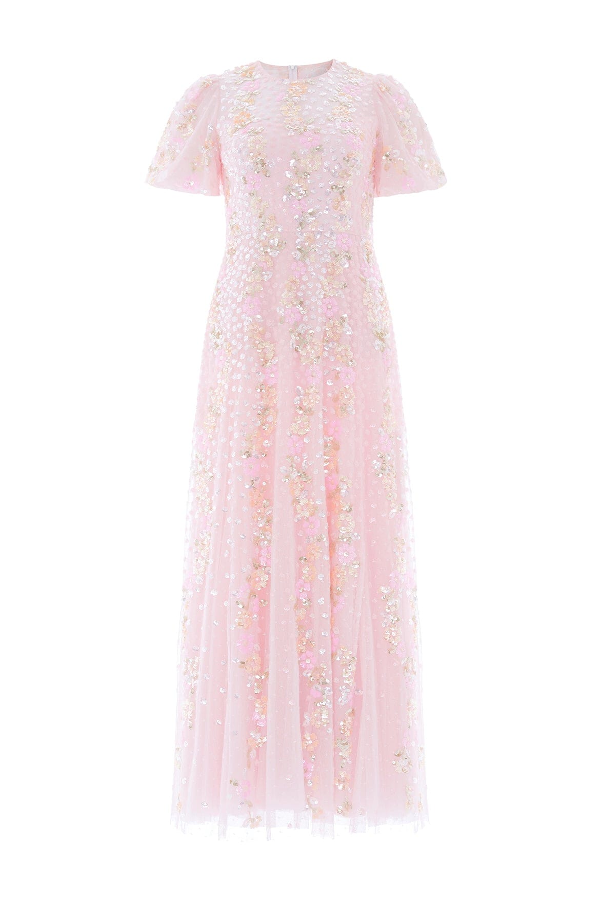 NEW SEASON. The Confetti Round Neck Ankle Gown in Peony Pink/Multi. Inspired by garden blooms in motion, this gown is adorned with scattered floral sequins that shimmer beautifully with movement. Finished with a round neckline and elegant ankle-length silhouette for refined occasionwear.