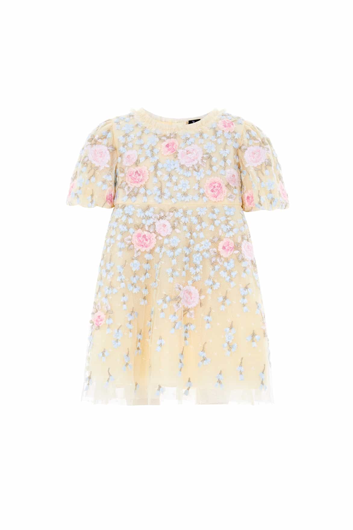 NEW SEASON. The Cressida Embroidery Baby Dress in Lemon Sorbet/Multi. Features tonal floral embroidery across a soft pastel tulle base. With flutter sleeves and a comfortable fit, it captures timeless Needle & Thread charm.