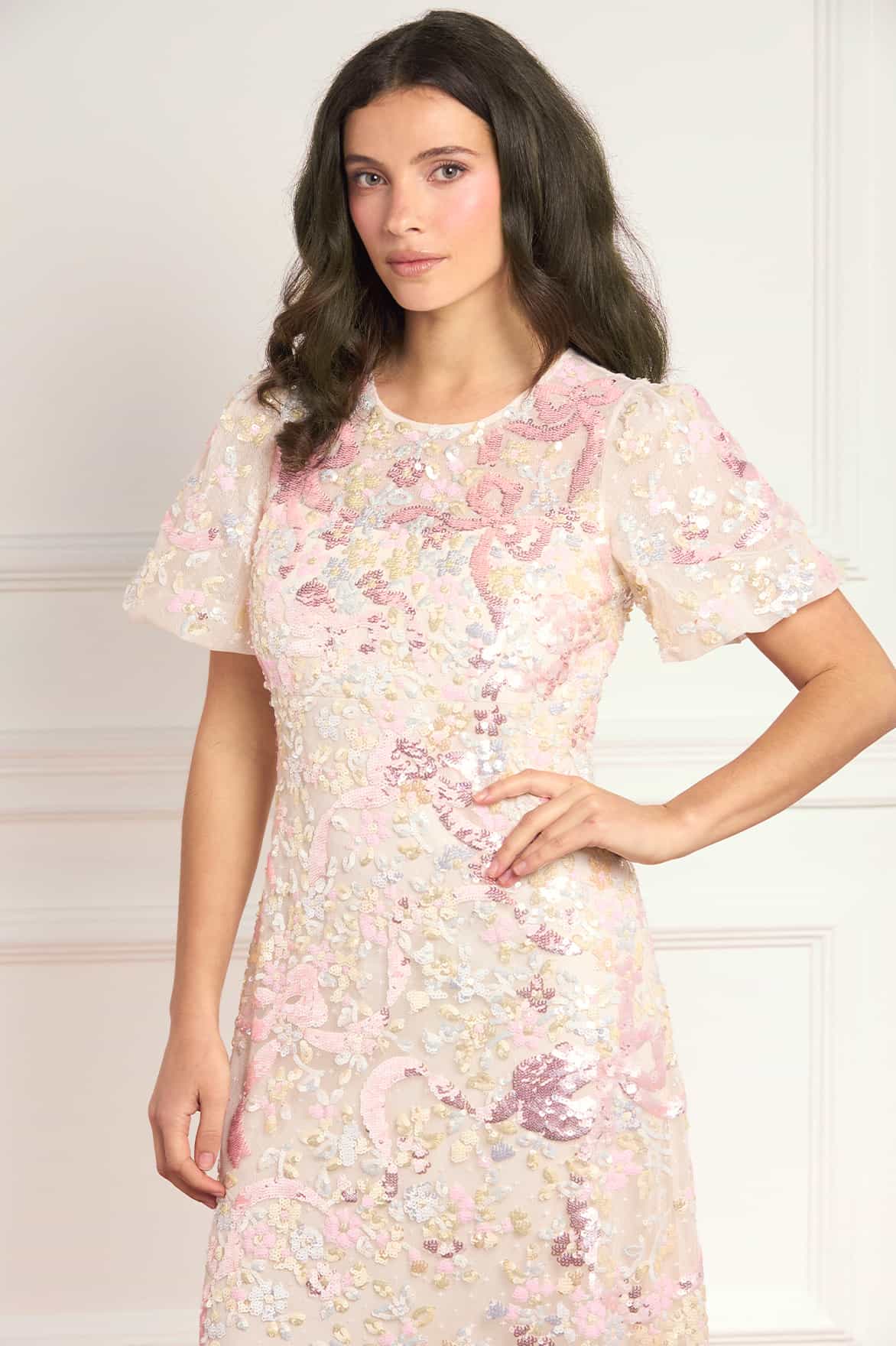 NEW SEASON. The Dancing Ribbon Puff Sleeve Gown in Cream/Multi. Exquisite sequin artwork depicts dancing ribbons and floral motifs in an organic trailing formation across the gown. Designed with puff sleeves and a slim silhouette, this style elongates the figure with delicate sparkle.