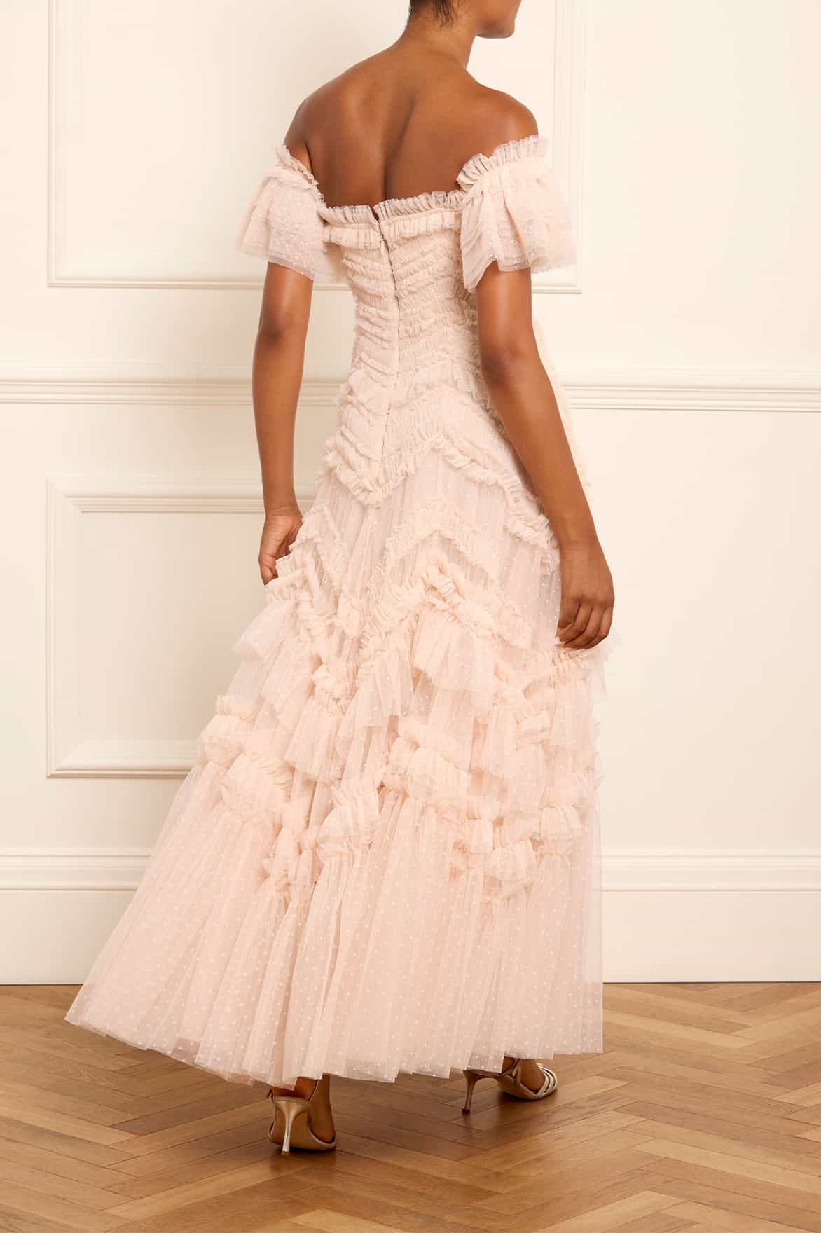 The Elia Off-Shoulder Gown in Dust Beige. This textile gown is beautifully designed with soft, delicate tulle ruffles that gradually increase in size towards the hem. Crafted with a romantic off-the-shoulder design and developed using layers of soft tulle trimmed with frills, adding to this statement look. The internal corset construction in stretch power-mesh ensures comfort and fit while maintaining the garment's shape and hold. The skirt is made up of generous layers of net and tulle with a sweeping hemline. Expect all eyes on you in this statement style.