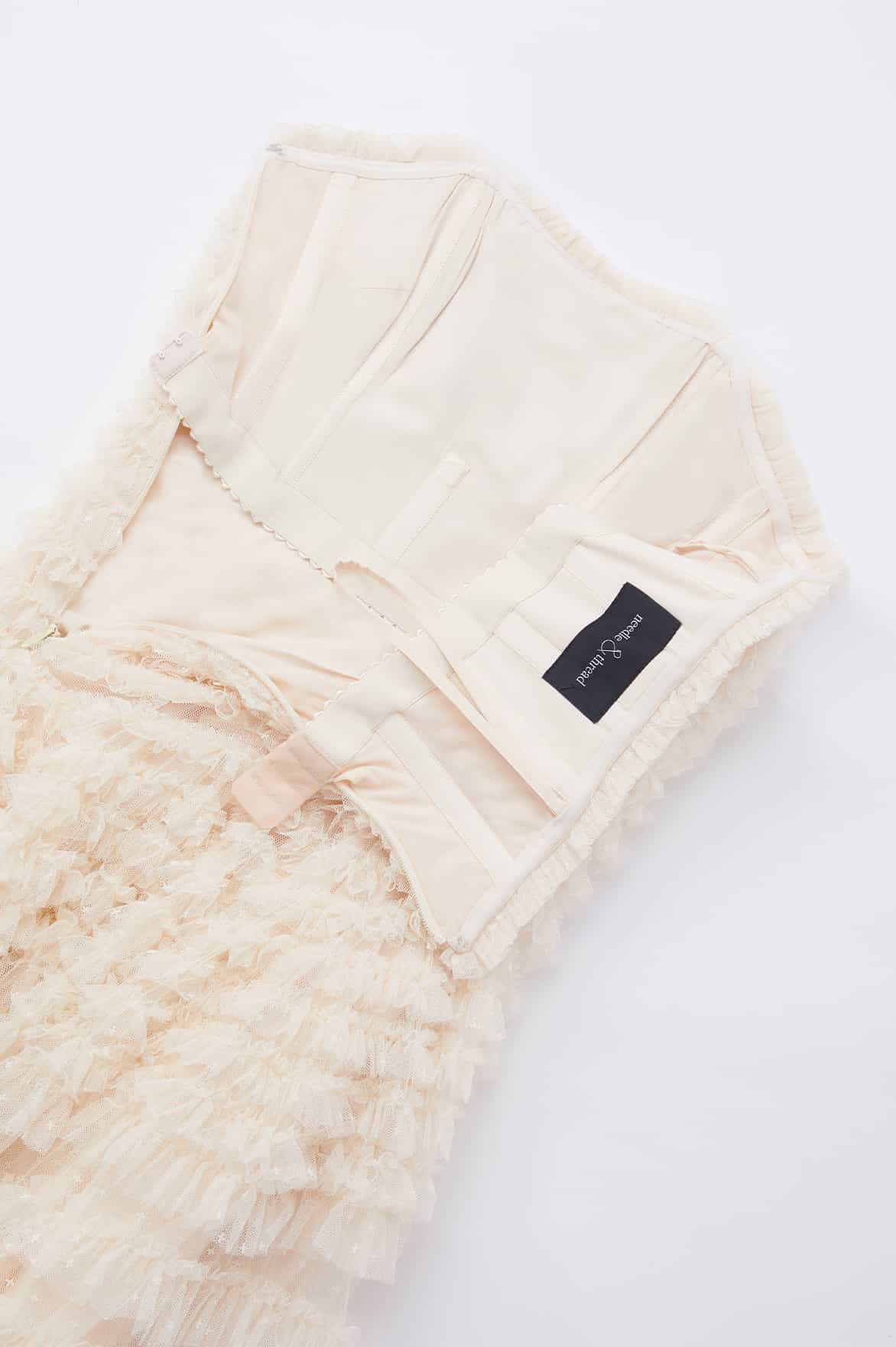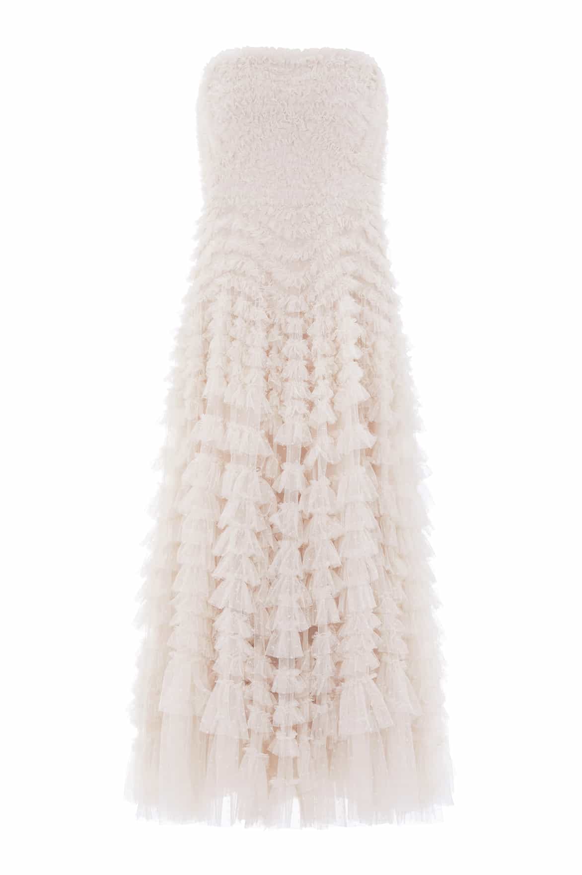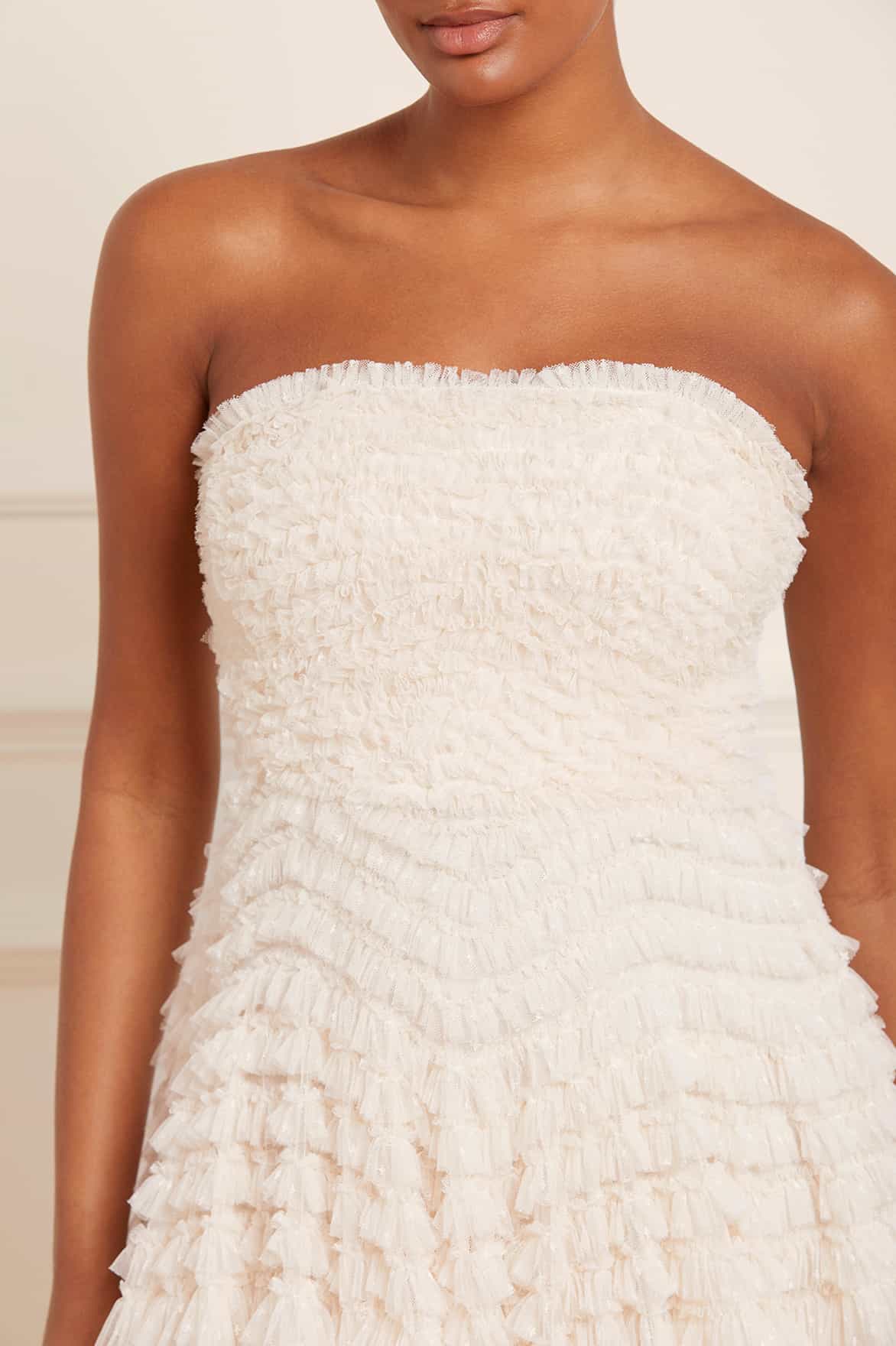 The Hattie Ruffle Strapless Ankle Gown in Cream. This gown is elegantly developed with layers of frothy tulle creating a soft, wavy textile. This strapless gown features signature Needle & Thread ruffles and frills for intricate, romantic detailing. Make the ultimate statement in the Hattie at your next event.