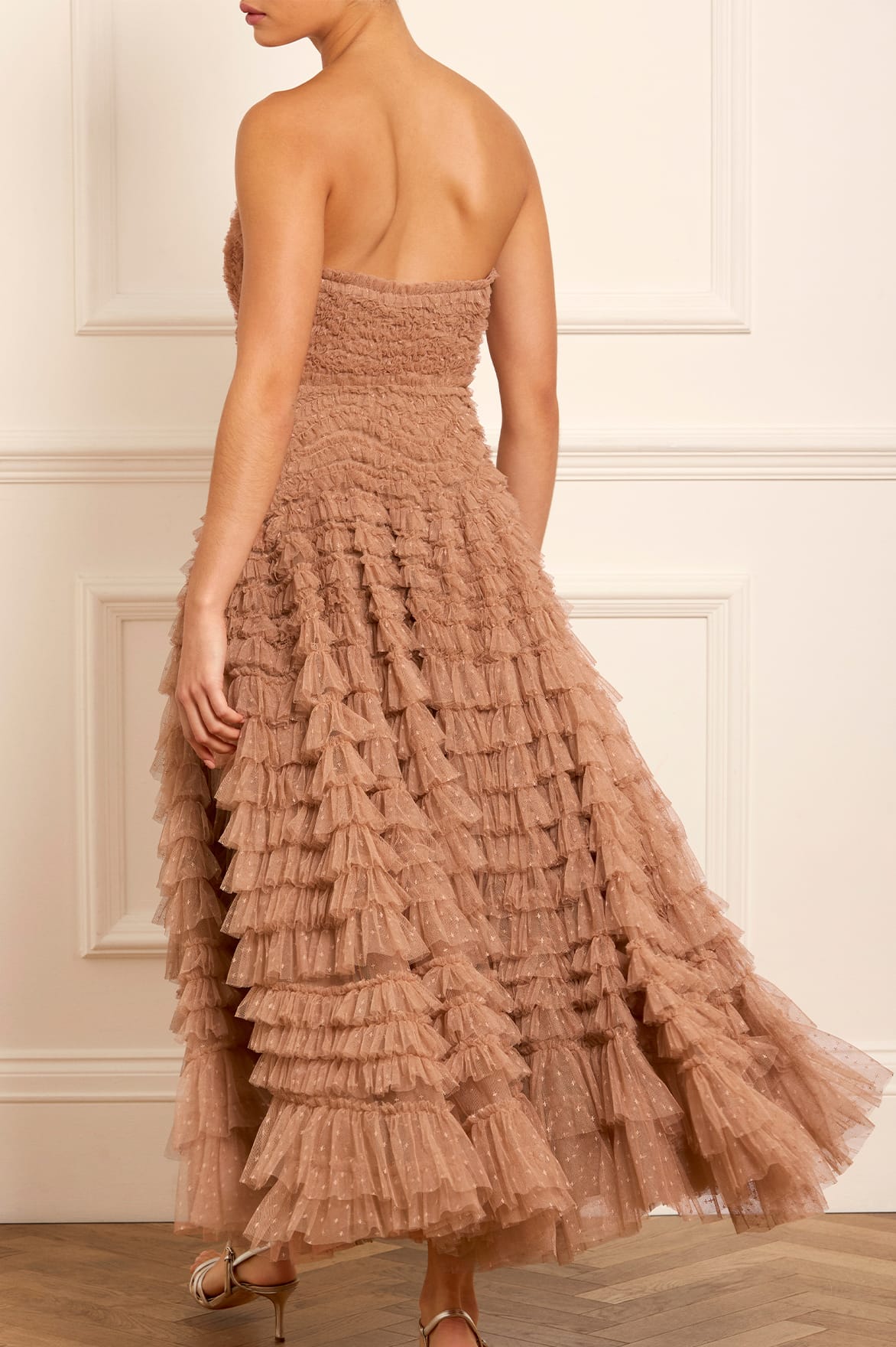 The Hattie Ruffle Strapless Ankle Gown in Mocha. Designed with a structured strapless bodice and soft tulle ruffles throughout. Layers of delicate ruffles create volume and movement, forming a romantic, statement silhouette. A modern yet feminine gown for special occasions.