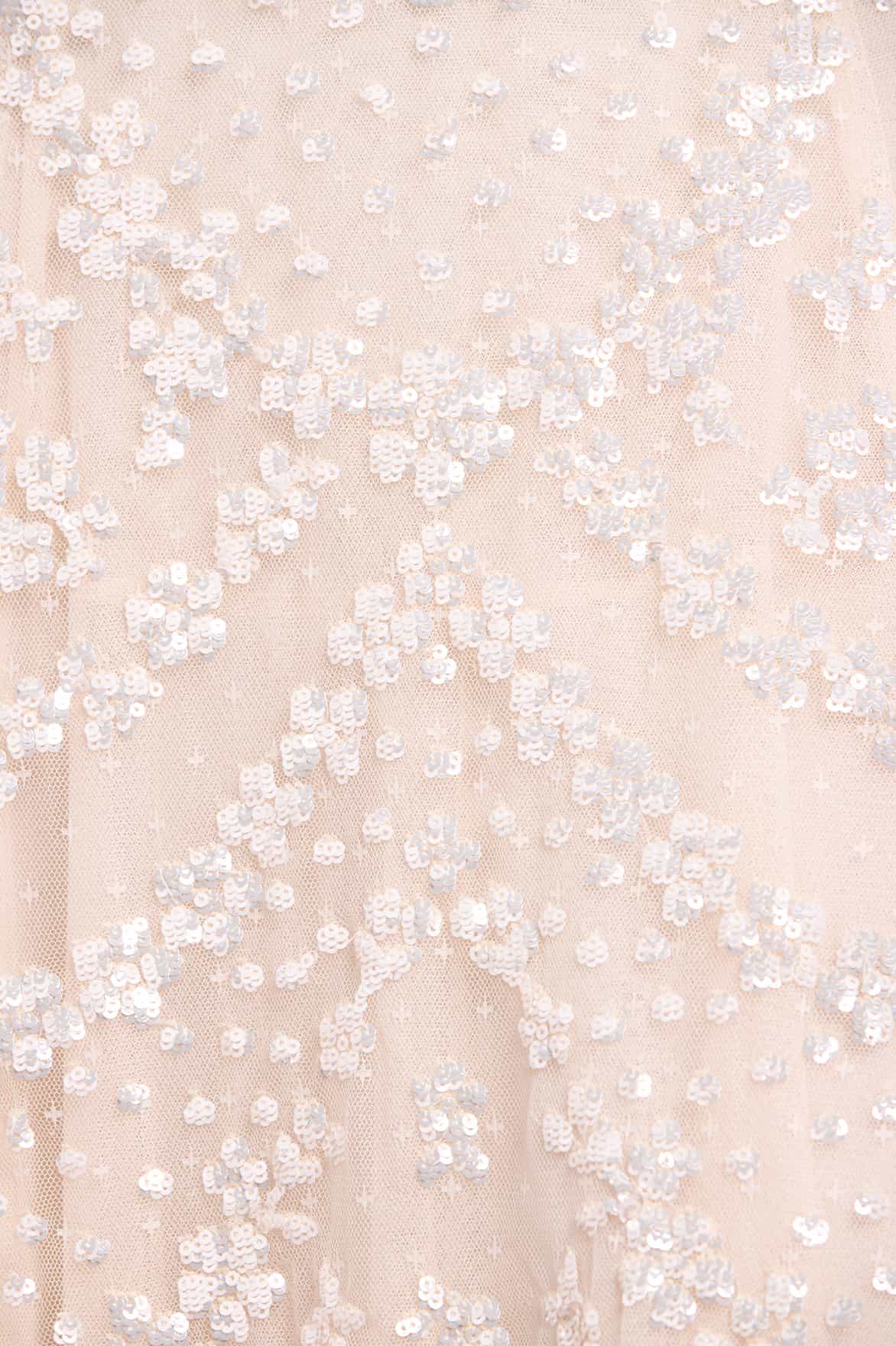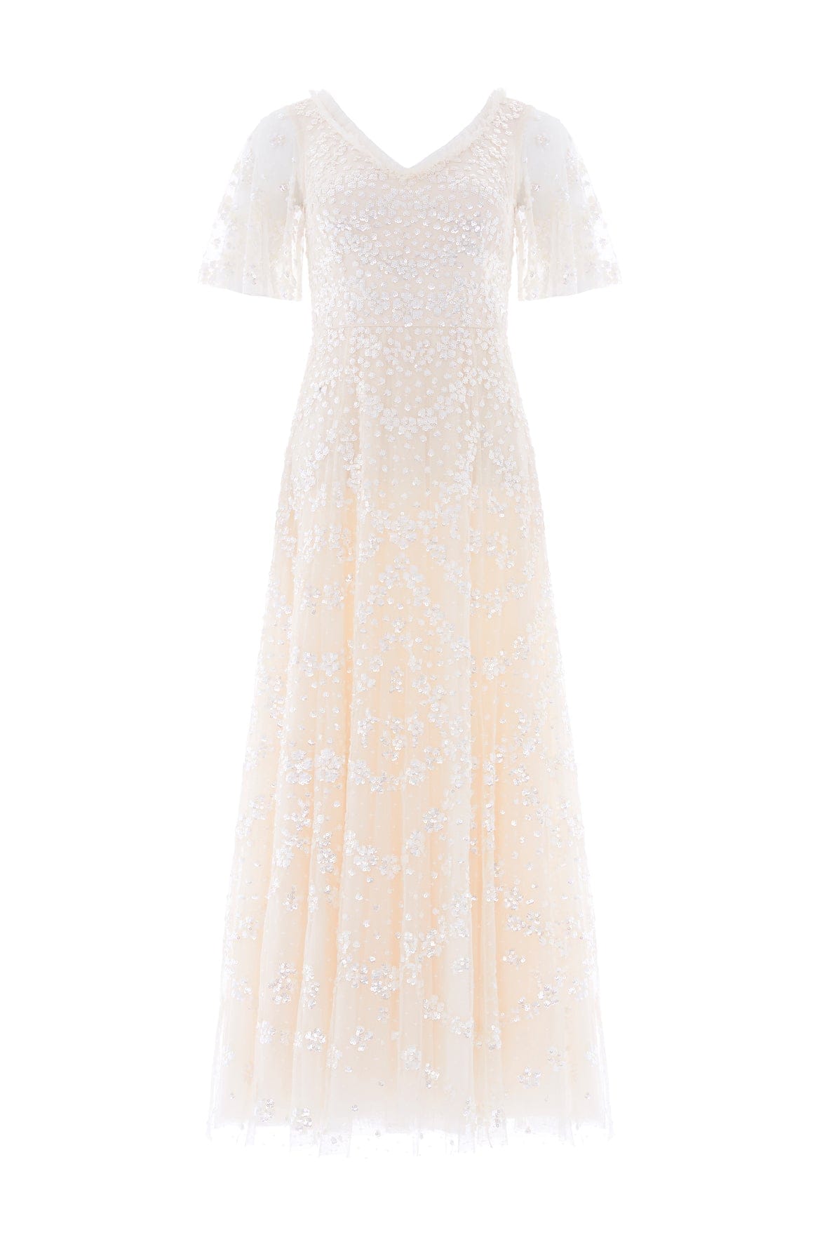 NEW SEASON. The Isobel Sequin Ankle Gown in Cream. Inspired by vintage lace designs, this ankle-length gown features delicate floral sequin motifs arranged in soft scalloped formations. The embellishment gradually becomes lighter towards the hem for a romantic, flattering finish.