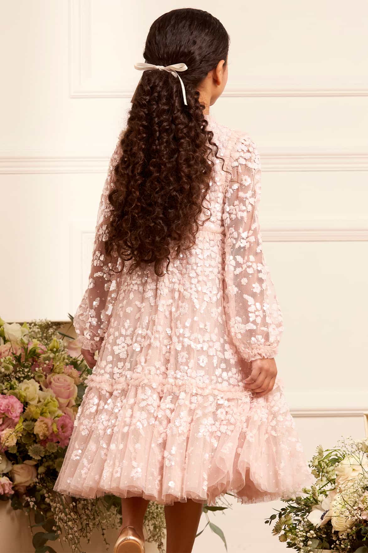 NEEDLE & THREAD EXCLUSIVE. The Maeva Long Sleeve Kids Dress in Pearl Pink is a Needle & Thread exclusive, featuring floral sequin motifs on the bodice and trailing floral borders fading towards the hem. Designed with foil-coated sequins add a lustrous shine, while the gathered skirt tier with a frothy ruffle gives it volume for twirling. Delicate tulle frills at the neckline, shoulders, and yoke complete this timeless, heritage-inspired design.