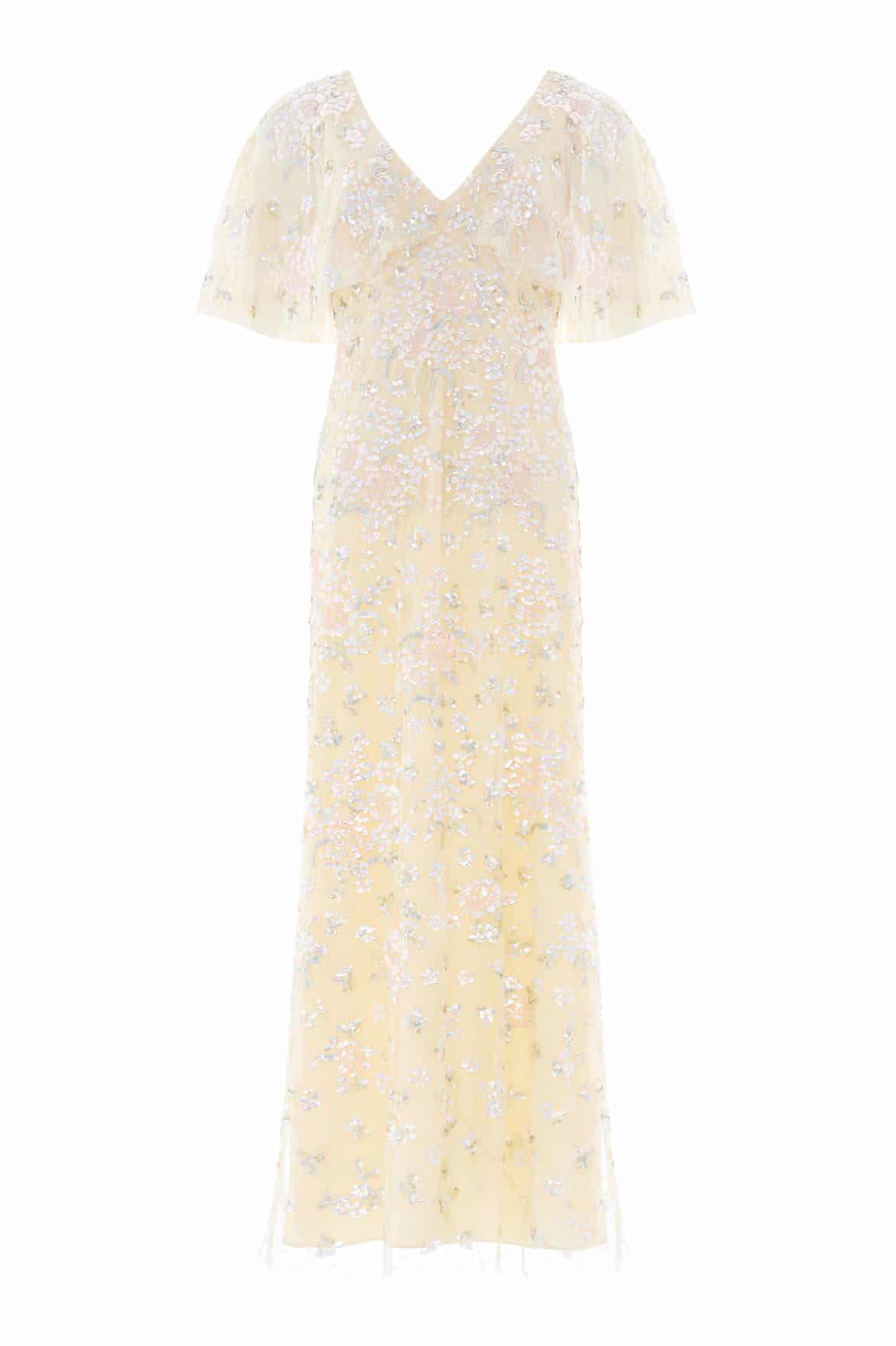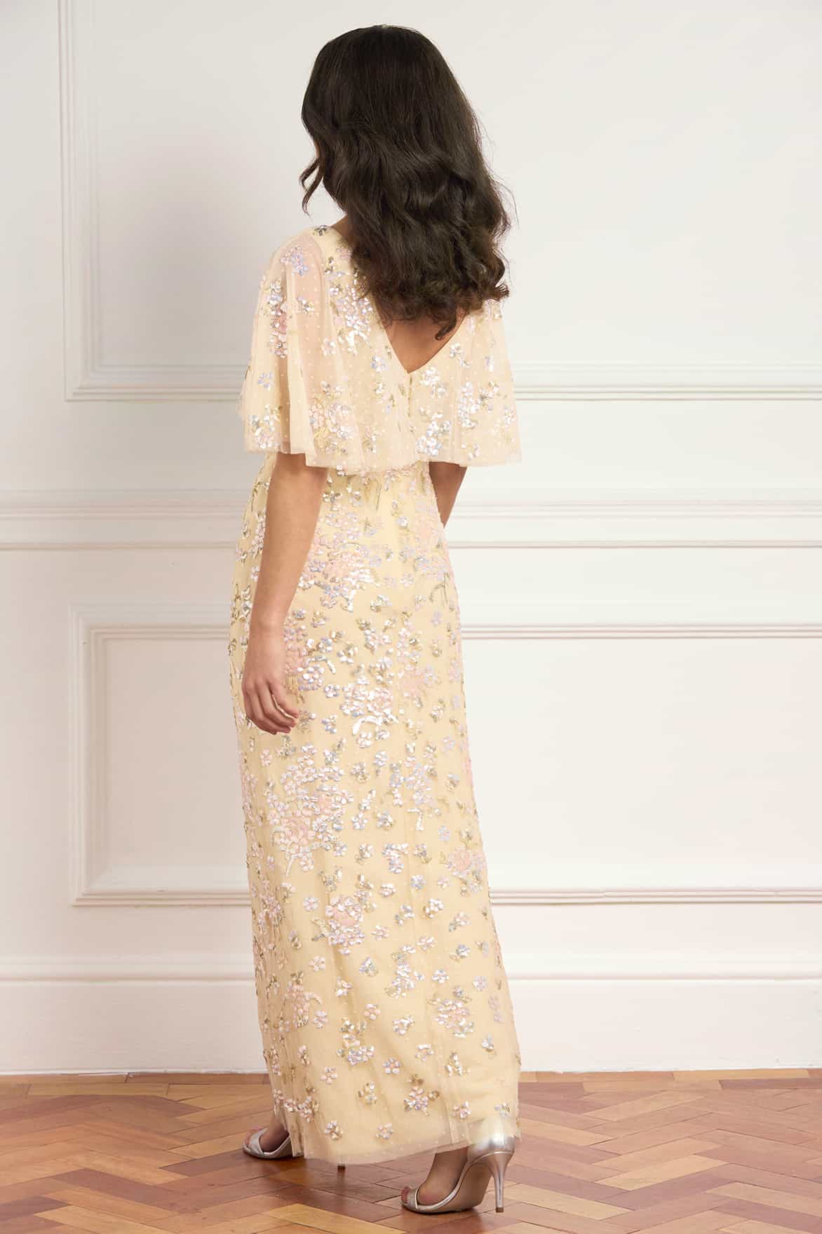 NEW SEASON. The Peony Bouquet Sequin V-Neck Cape Gown in Lemon Sorbet/Multi. Exquisite sequin floral artwork inspired by antique botanical paintings adorns this elegant gown. Designed with an integrated cape and a slim silhouette, it is finished with a bias-cut lining for a smooth, body-skimming fit and effortless wear.