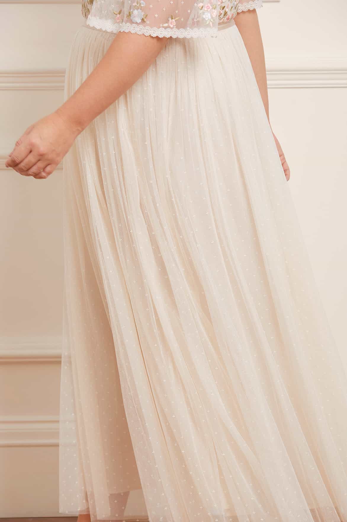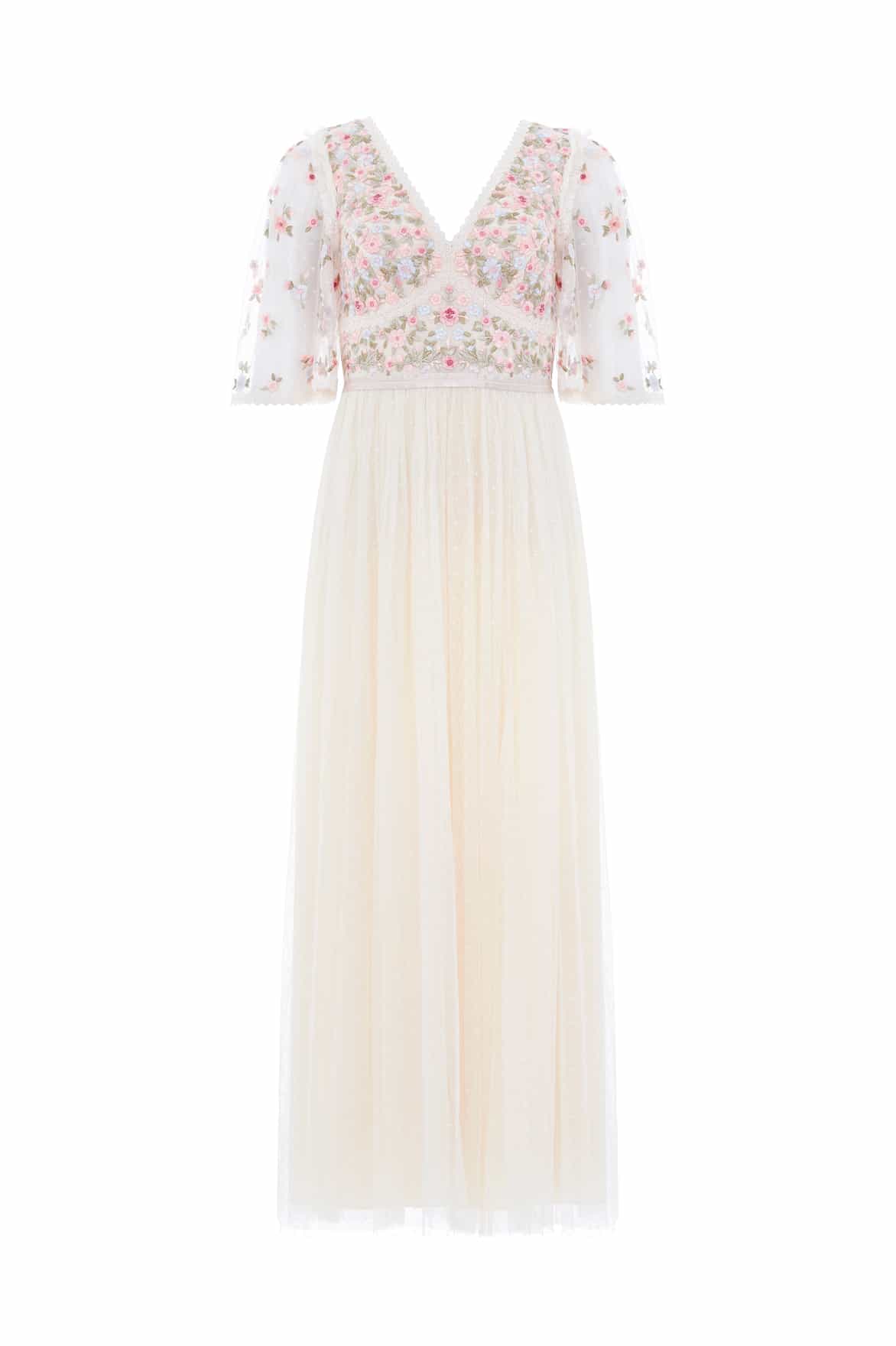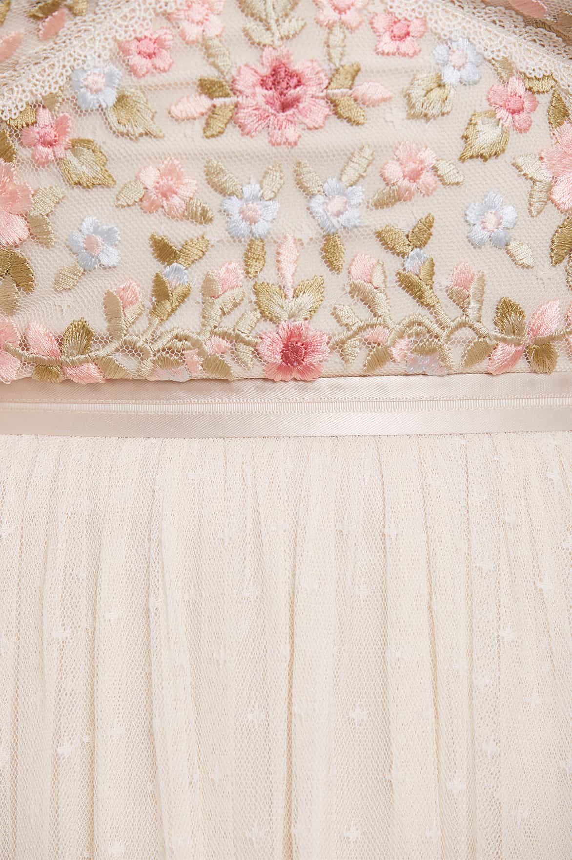 The Ribbon Bouquet Bodice Ankle Gown in Champagne/Pink Multi. The bodice of this gown is intricately designed with embroidered bouquets of flowers in rich tones, inspired by a 1930s vintage print. Beautifully adorned with delicate lace trims for signature Needle & Thread detailing. The skirt features layers of tulle to create a romantic silhouette. The perfect gown for an upcoming occasion.
