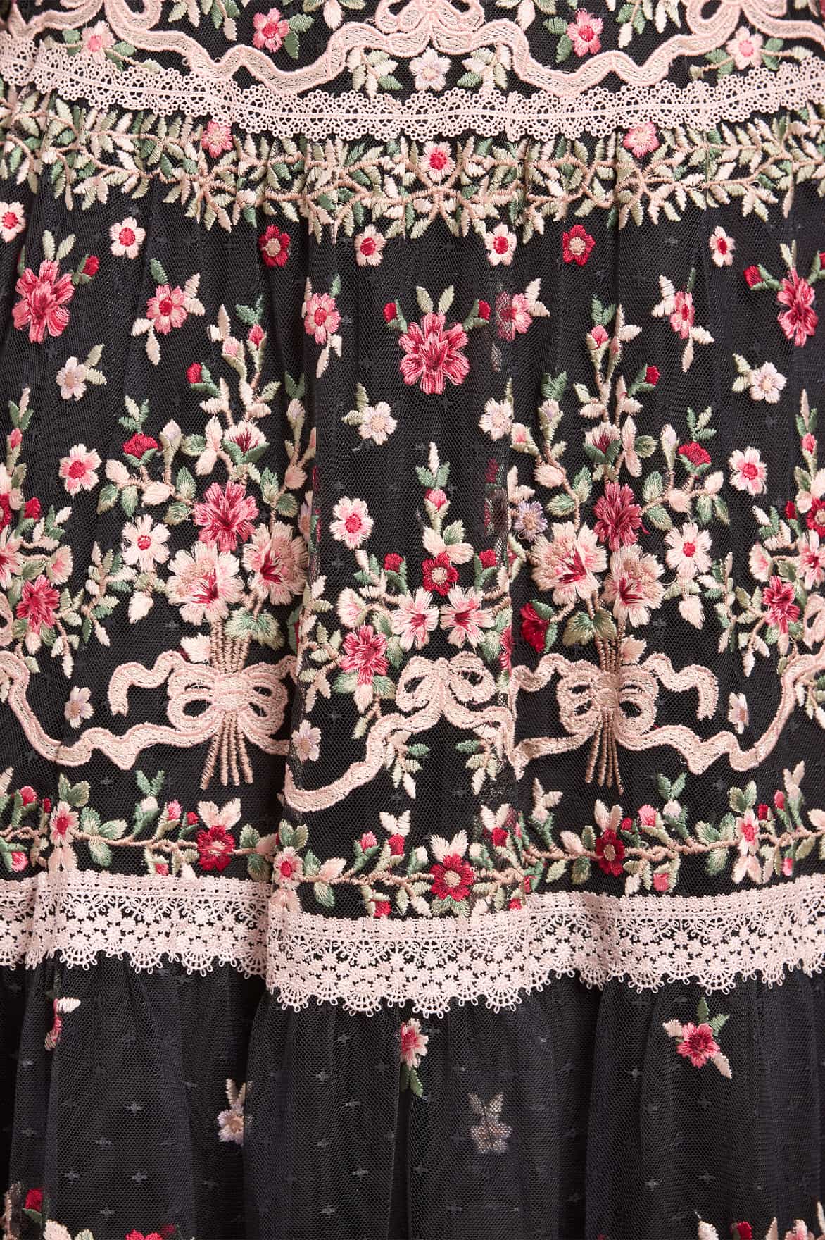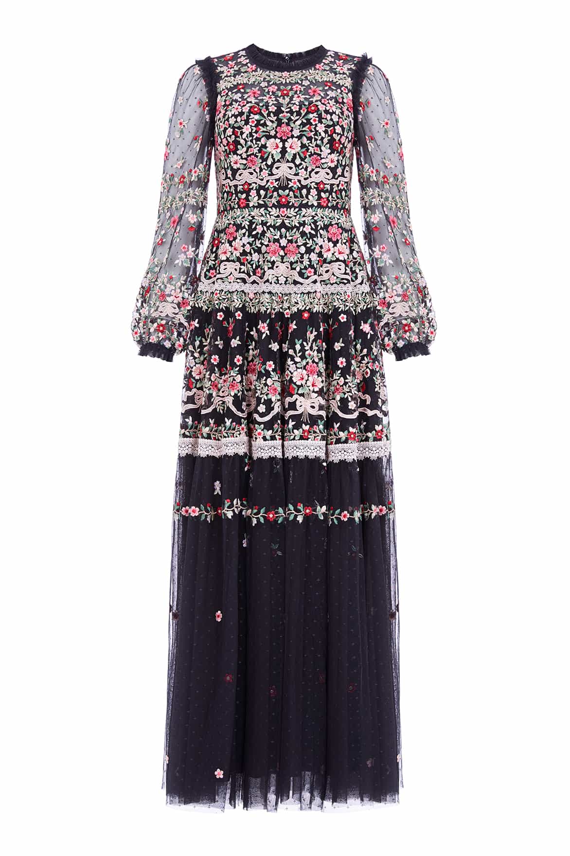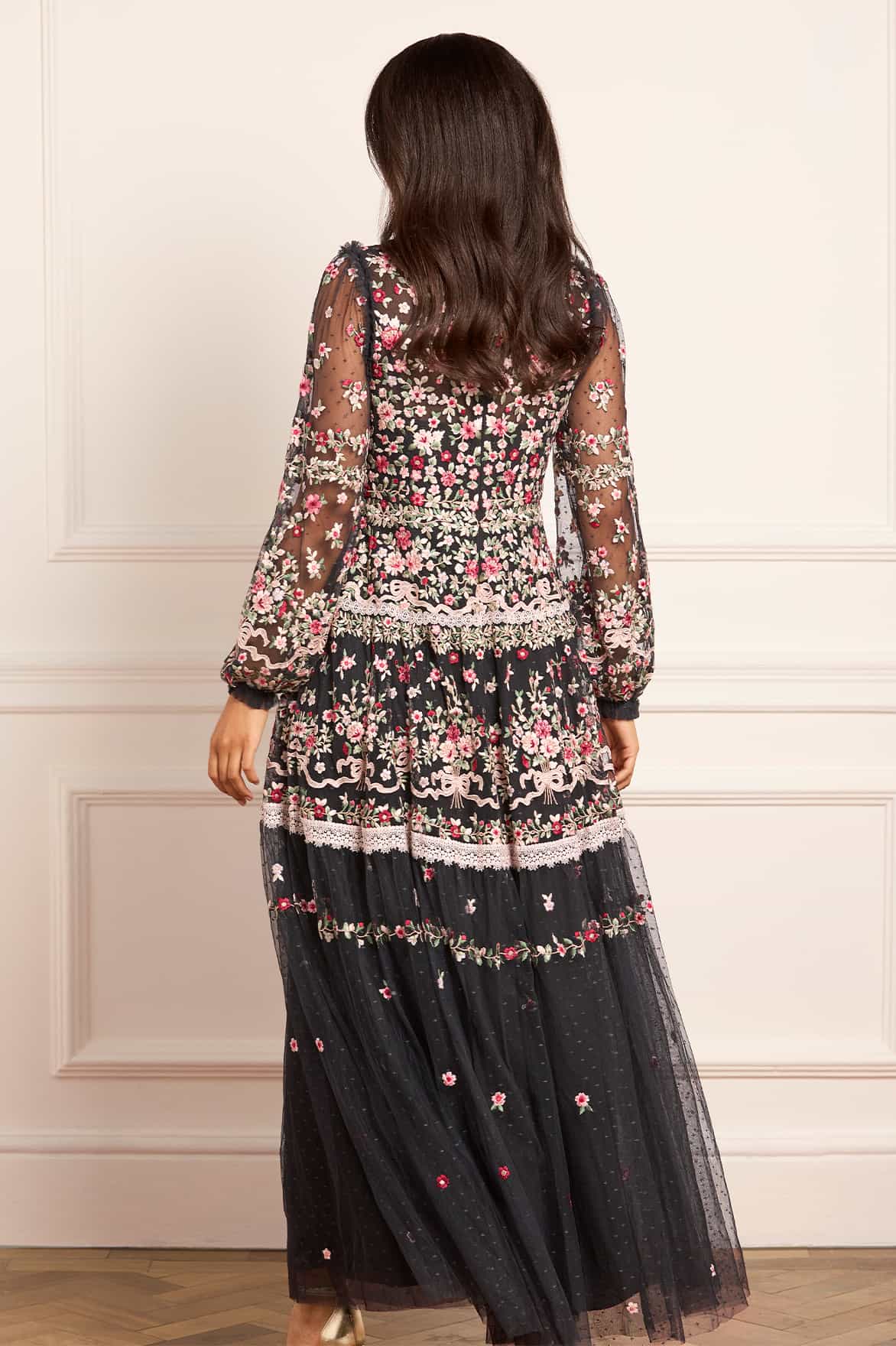 NEEDLE & THREAD EXCLUSIVE. The Ribbon Bouquet Gown in Graphite. This gown is intricately designed with embroidered bouquets of flowers in rich tones, inspired by a 1930s vintage print. Beautifully adorned with delicate lace trims for signature Needle & Thread detailing. The skirt is developed with layers of tulle to create a romantic silhouette. The perfect gown for an upcoming occasion.