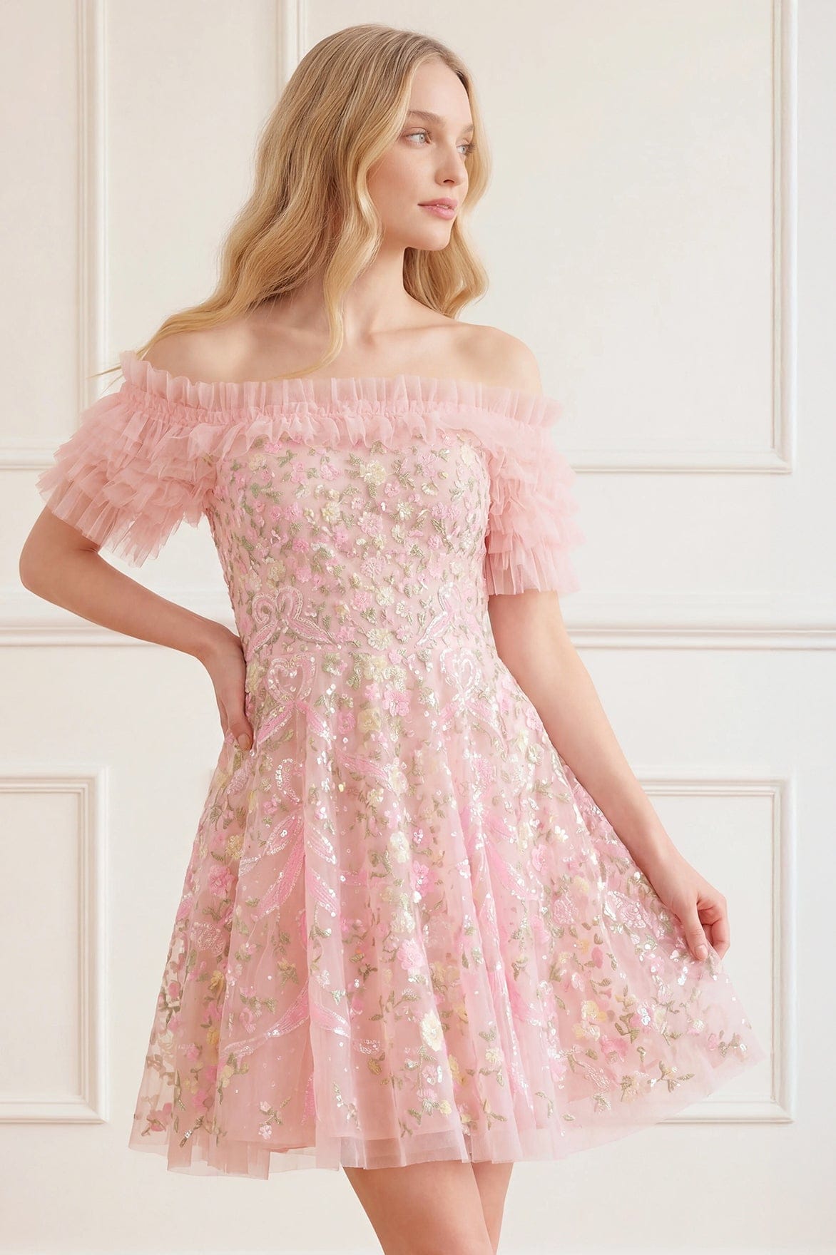 - Kisses tulle decorated with floral embroidery and contrast sequins