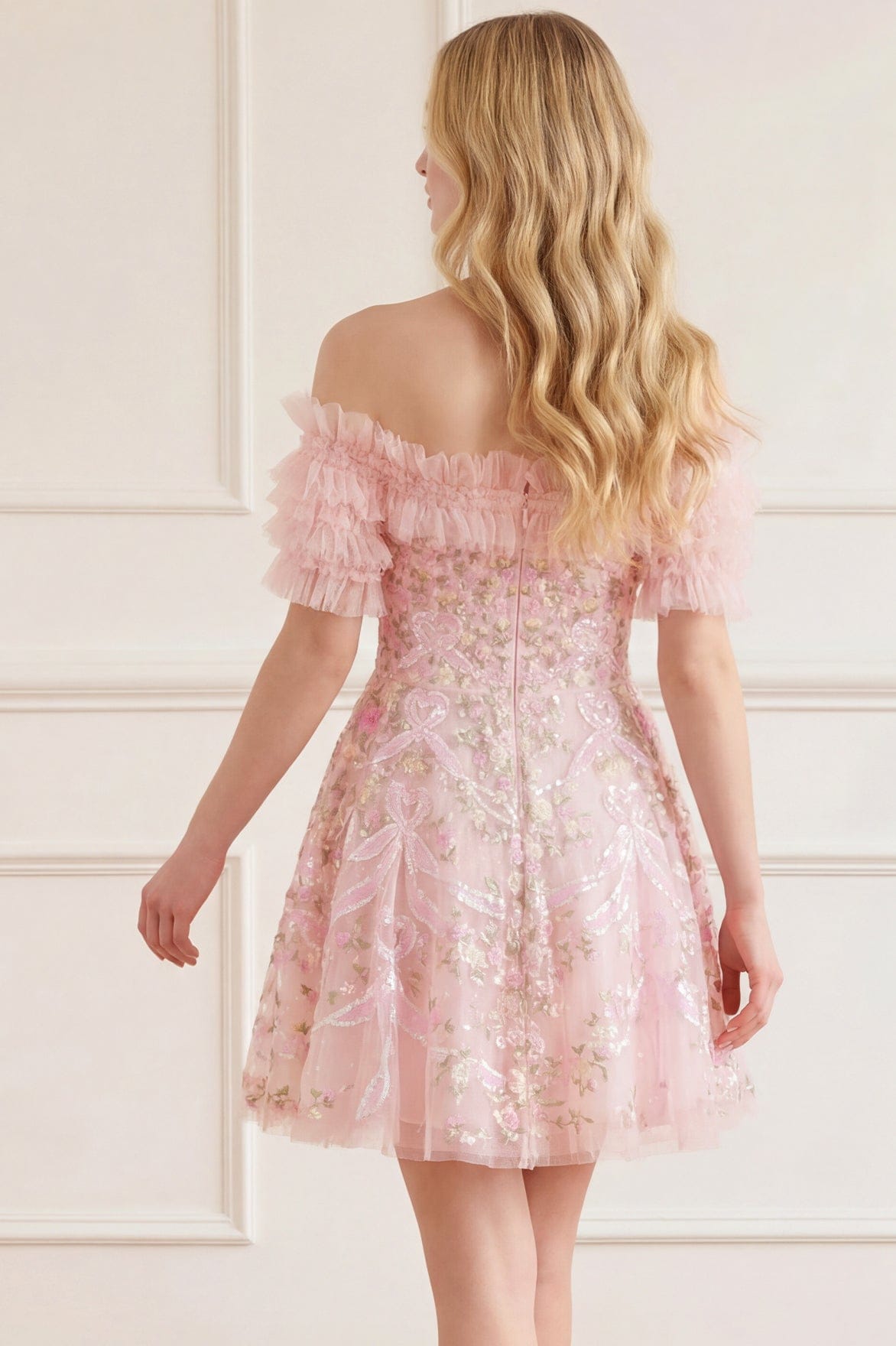 NEW SEASON. The Ribbon Heart Off-Shoulder Micro Mini Dress in Peony Pink/Multi. A playful micro mini silhouette adorned with ribbon heart motifs inspired by romantic garden details. Designed with an off-shoulder neckline, this style balances femininity with a modern, statement feel.
