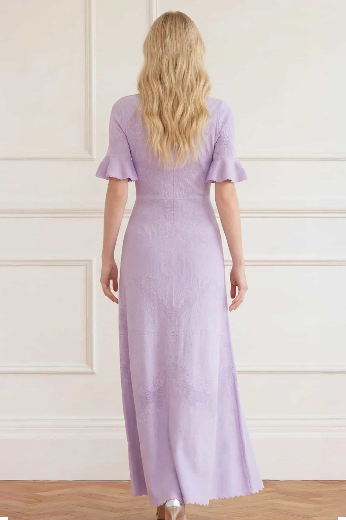 NEW SEASON. The Scallop Lace Pointelle Knit Gown in Powder Lilac. Inspired by classic lace designs, this pointelle knit gown features intricate scalloped detailing throughout. The softly fitted silhouette creates a refined yet comfortable option for occasion dressing.