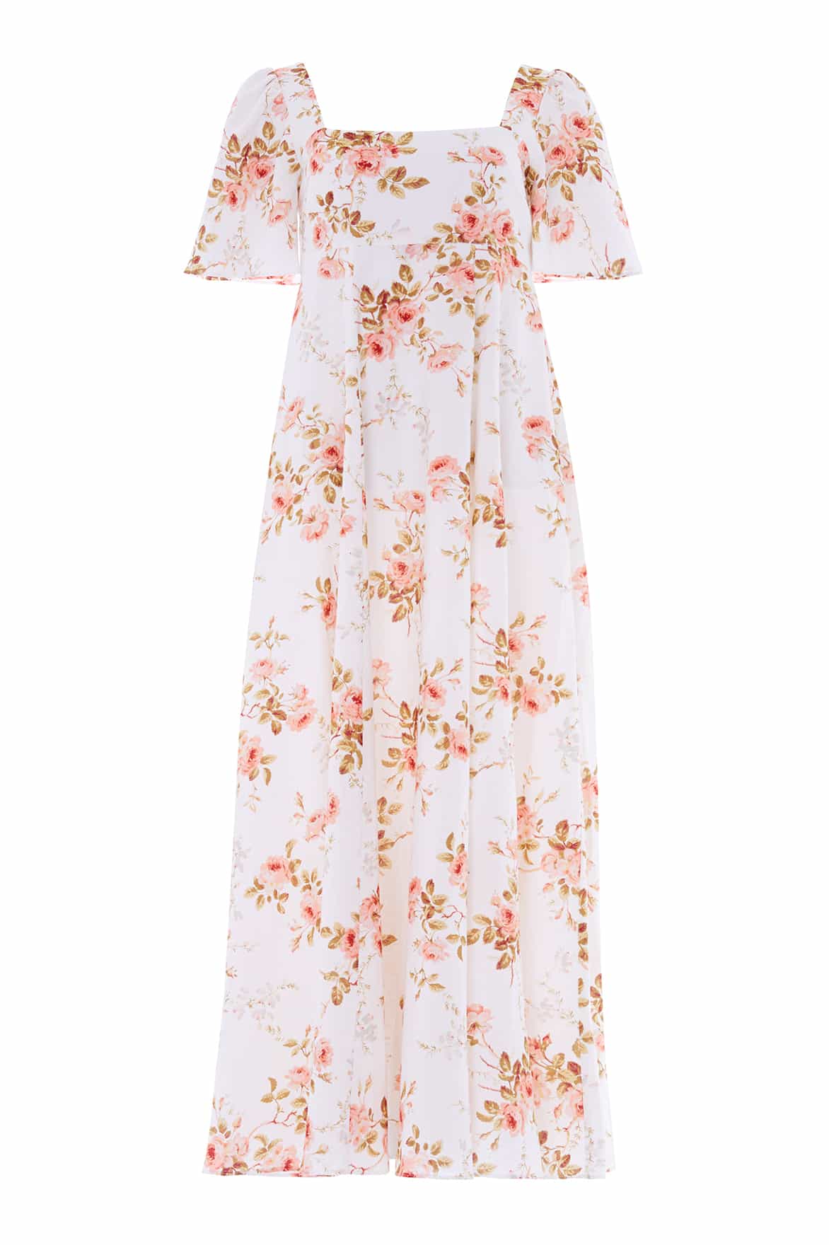 NEW SEASON | NEEDLE & THREAD EXCLUSIVE. The Summer's Rose Linen Blend Short Sleeve Ankle Gown in White. This romantic ankle gown features the Summer’s Rose print across a breathable linen blend fabrication. Designed with soft short sleeves and a flowing silhouette, it offers effortless femininity with natural ease.