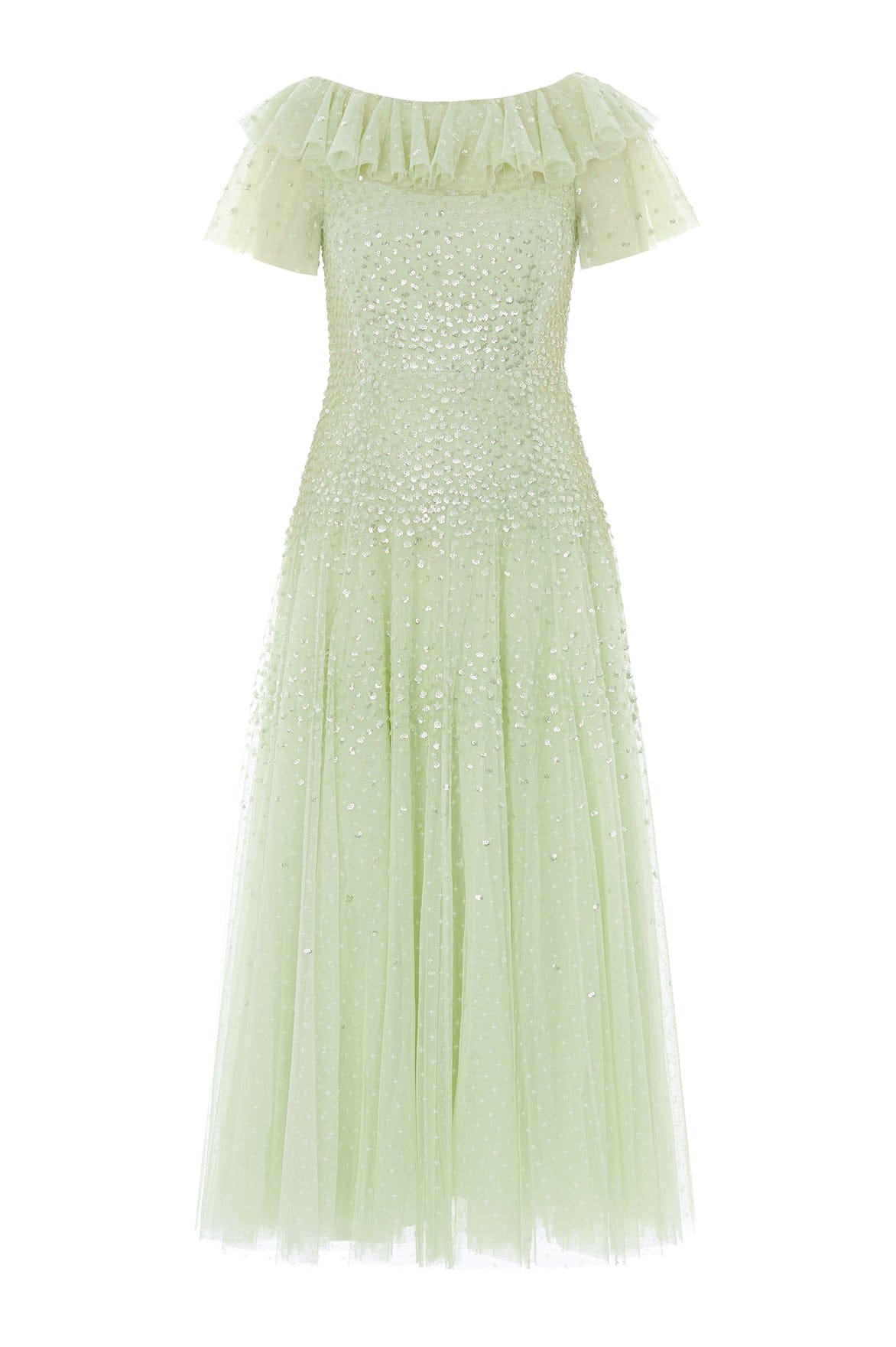 NEW SEASON. The Sunrise Sequin Short Sleeve Ankle Gown in Peppermint. Embellished with delicate sequin dot motifs arranged in softly fading linear bands that gently fade in and out, creating a subtle glittering effect. Designed with elegant short sleeves and a flowing silhouette that moves beautifully with every step. A radiant choice for luxury evening wear and special occasions.