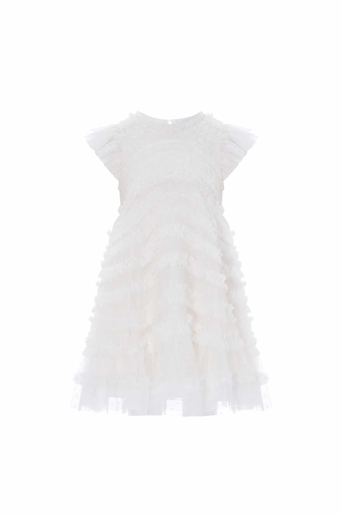NEW SEASON. The Amara Ruffle Sleeve Kids Dress in Swan White. This beautifully romantic kids dress is designed with a relaxed fit, soft ruffle sleeves and a multi-layered full skirt for magical movement. Inspired by English gardens, it offers an easy-to-wear yet luxurious silhouette. A timeless flower girl style, thoughtfully designed to echo the Amara Ruffle Backless Gown, for coordinated Mummy & Me look.