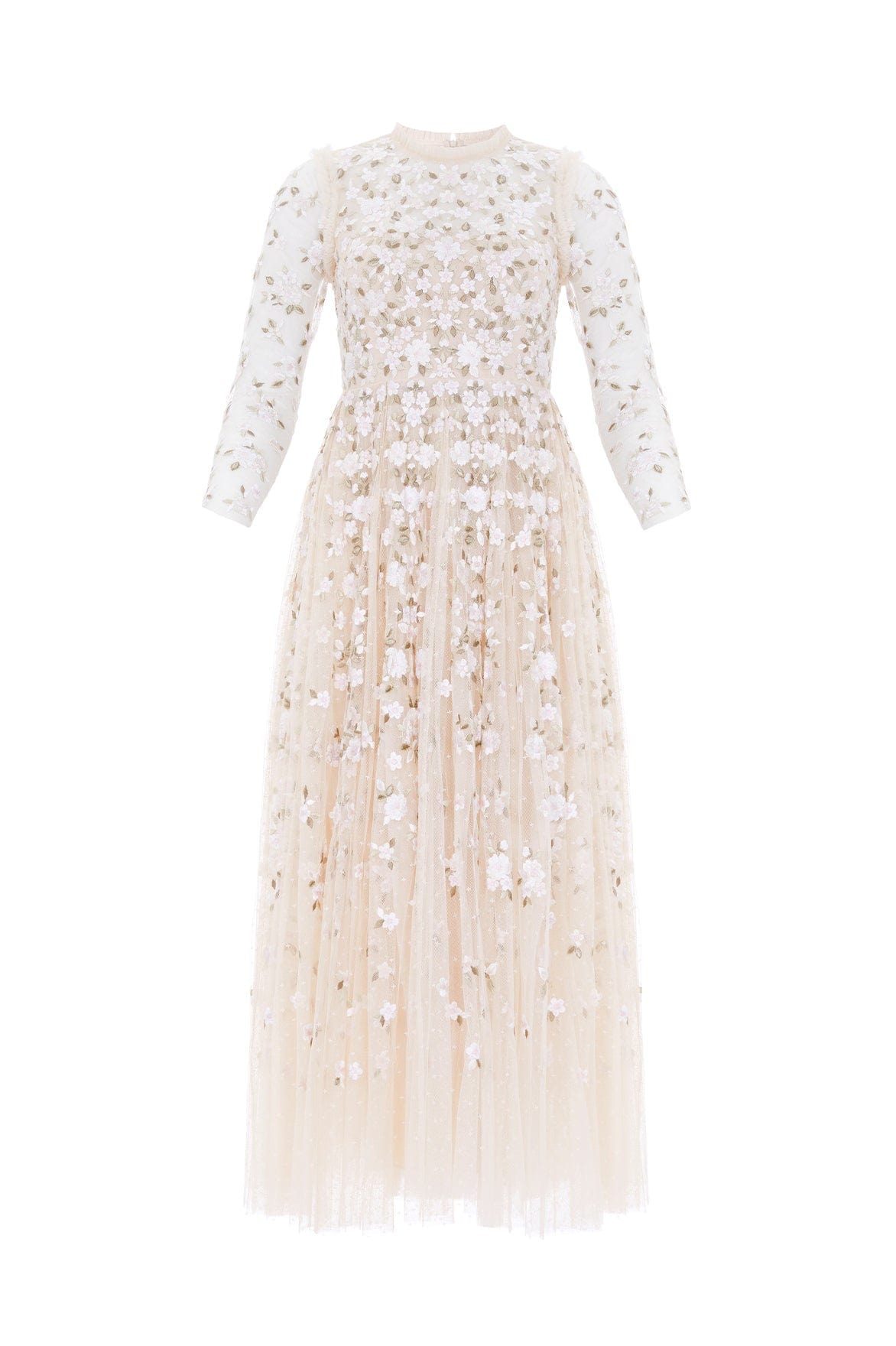 The Camellia Ditsy Ankle Gown in Champagne / White. A beautifully classic Needle & Thread style. The artwork of this dress is embroidered with floral motifs on soft, pretty tulle. This dress features a full pleated skirt, creating a voluminous shape for added movement. Be the first to make a statement in the Camellia.