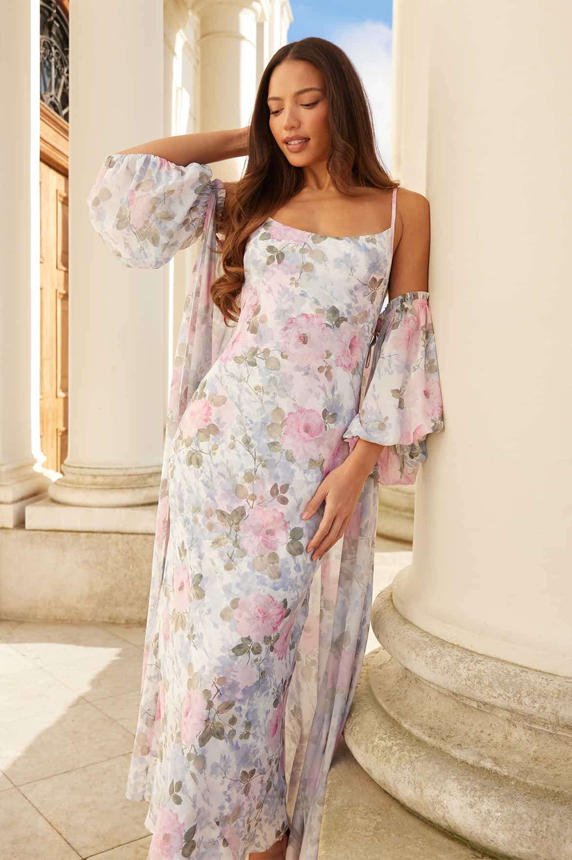 NEW SEASON | NEEDLE & THREAD EXCLUSIVE. The Camille’s Garden Azeline Chiffon Off-Shoulder Cape in Moonshine. Features a delicate floral print inspired by hand-painted artwork from the early 1900s. Designed with an elegant off-shoulder neckline and flowing chiffon cape, this exclusive style exudes effortless romance.
