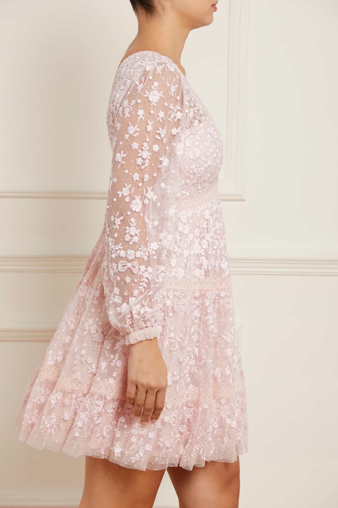 The Celestia Ribbon Mini Dress in Petal Pink / Pale Pink. This mini dress has been intricately designed with rich embroidery inspired by vintage lace, featuring delicate floral motifs and ribbon bows throughout. Crafted with pretty lace trims for signature Needle & Thread detailing, and delicately constructed with a textured tulle fabric base. Featuring a V-shaped neckline and a new, ultra-flattering silhouette. Make the ultimate statement in the Celestia.