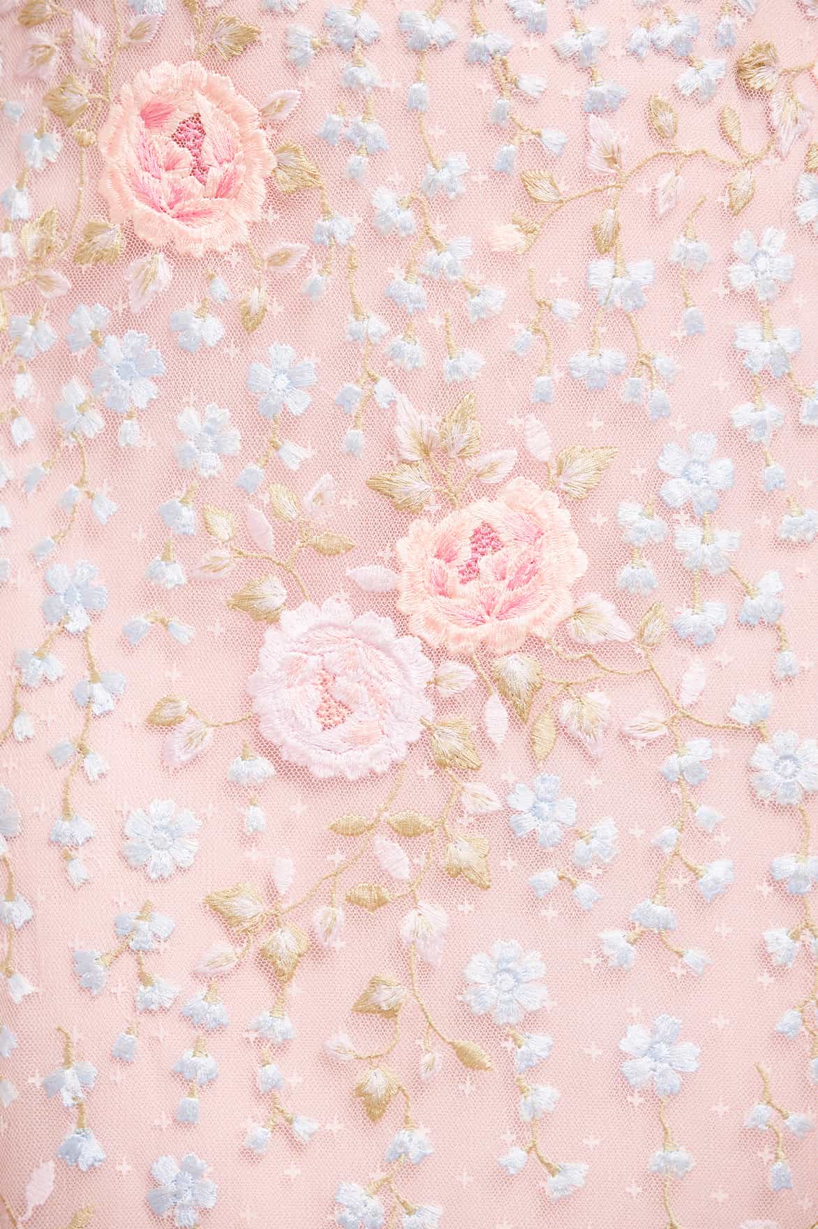 NEW SEASON. The Cressida Embroidery Puff Sleeve Ankle Gown in Seashell/Multi. Showcases exquisite peony embroidery cascading towards the hem. Featuring gently gathered puff sleeves and a flowing tulle skirt, this gown exudes romance and grace from every angle.