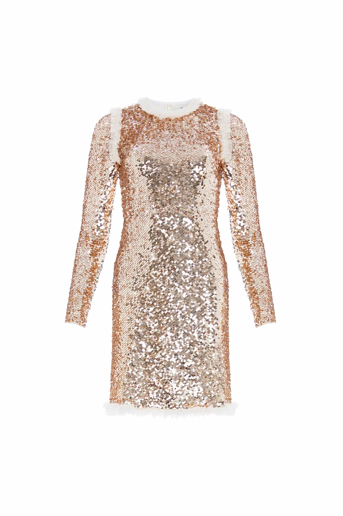The Eclipse Valerie Micro Mini Dress in Gold. This mini dress is created in a stretch base fabric decorated with shimmering sequins for a high shine, luxe finish. Developed with our stretch power mesh fabric for a cinched fit for comfort and style. Beautifully adorned with delicate tulle frills for a signature Needle & Thread finish. Shine at your next event in this statement piece.