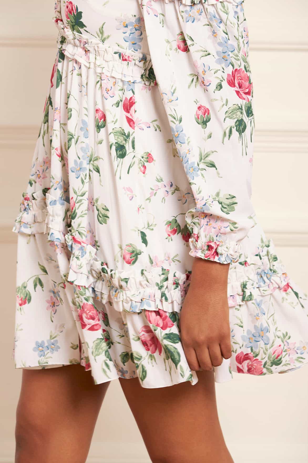 The Floral Fantasy Crepe Off-Shoulder Micro Mini Dress in Moonshine. Designed with a beautiful floral print taken from an early 1900’s hand-painted wallpaper design. Decorated with romantic garden florals that create an all-over, organic layout in a whimsical flower artwork. Designed with a contemporary cold-shoulder detail and signature frills adorning the sleeves and bodice adding a romantic edge. Crafted with a loose-fit silhouette for an effortless, whimsical look. A transitional day to night piece.