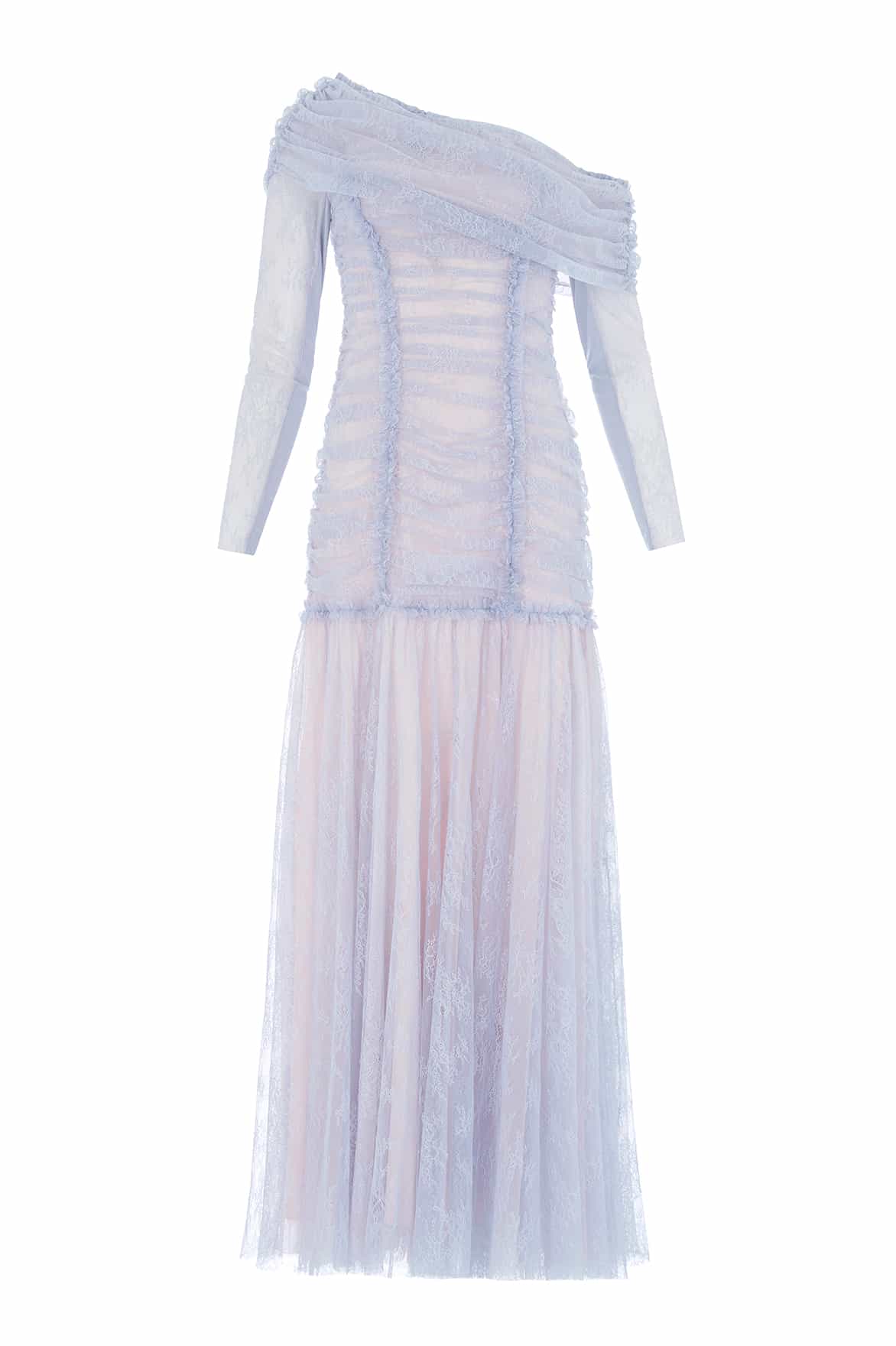 NEW SEASON. The Gigi Lace One-Shoulder Rouched Gown in Skylight/Seashell. A romantic statement crafted from delicate lace. Designed with a ruched bodice and one-shoulder silhouette, this gown combines soft texture and modern elegance in a refined pastel palette.
