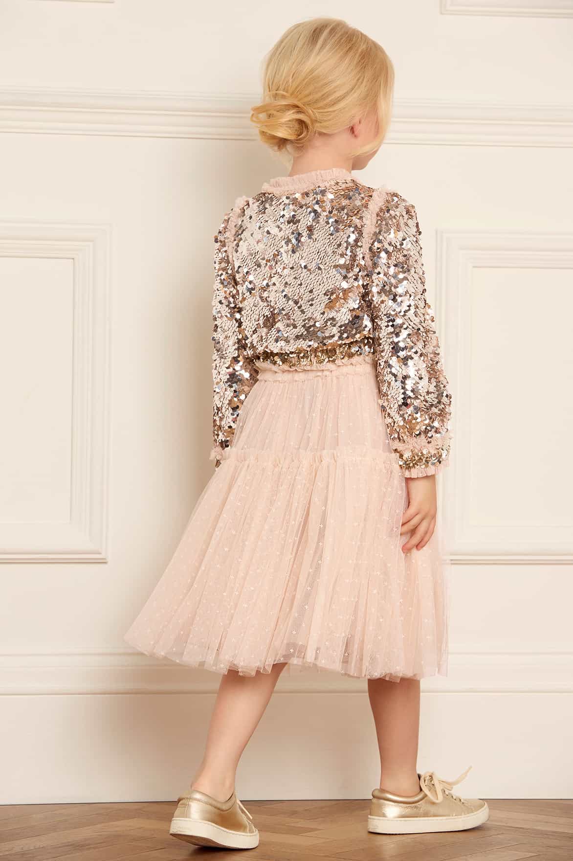 The Hallie KIDS Bomber Jacket in Silver. Reintroducing a signature archive product: The Needle & Thread bomber jacket. This playful cropped bomber is designed to be styled with our Tulle KIDS Skirt for the prettiest statement co-ord. Developed with signature frills on the cuffs, shoulders, and around the zip, creating a frothy texture. This charming piece is embellished with a specially developed all-over sequin fabric, made by intricately applying delicate side-hole sequins that overlap to form a decadent, luxe, shimmering effect. This bomber will be the star of their wardrobe.