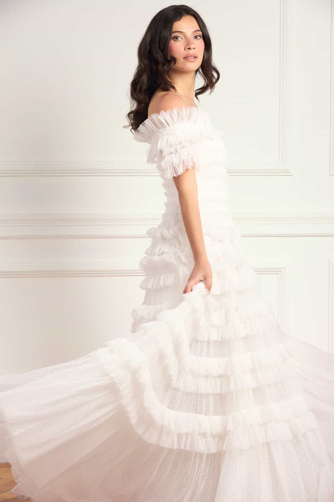 NEW SEASON | NEEDLE & THREAD EXCLUSIVE. The Lisette Ruffle Off-Shoulder Gown in Swan White. A statement off-shoulder gown adorned with cascading ruffles that enhance the silhouette with graceful movement. The softly structured bodice flows into a fluid skirt for timeless elegance.