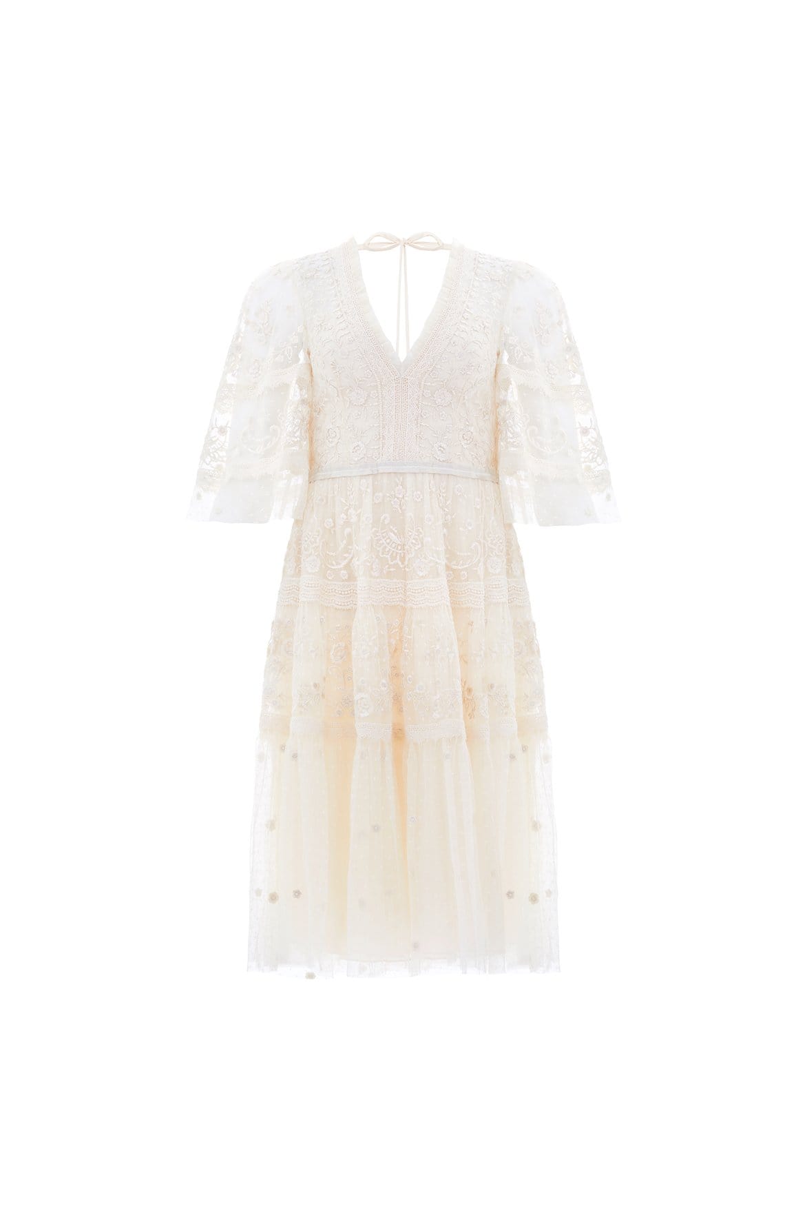 The Lottie Lace Midi Dress in Champagne. A signature Needle & Thread style, updated for the new season ahead. Taking inspiration from Victorian lace, the Lottie features intricately embroidered artwork in a tonal thread featured on delicate tulle. Lace trims border the neckline and frame each tier of the skirt. This embroidered lace dress has sheer, romantic sleeves and our signature grosgrain ribbon at the waist. The perfect dress to take you from day to night.