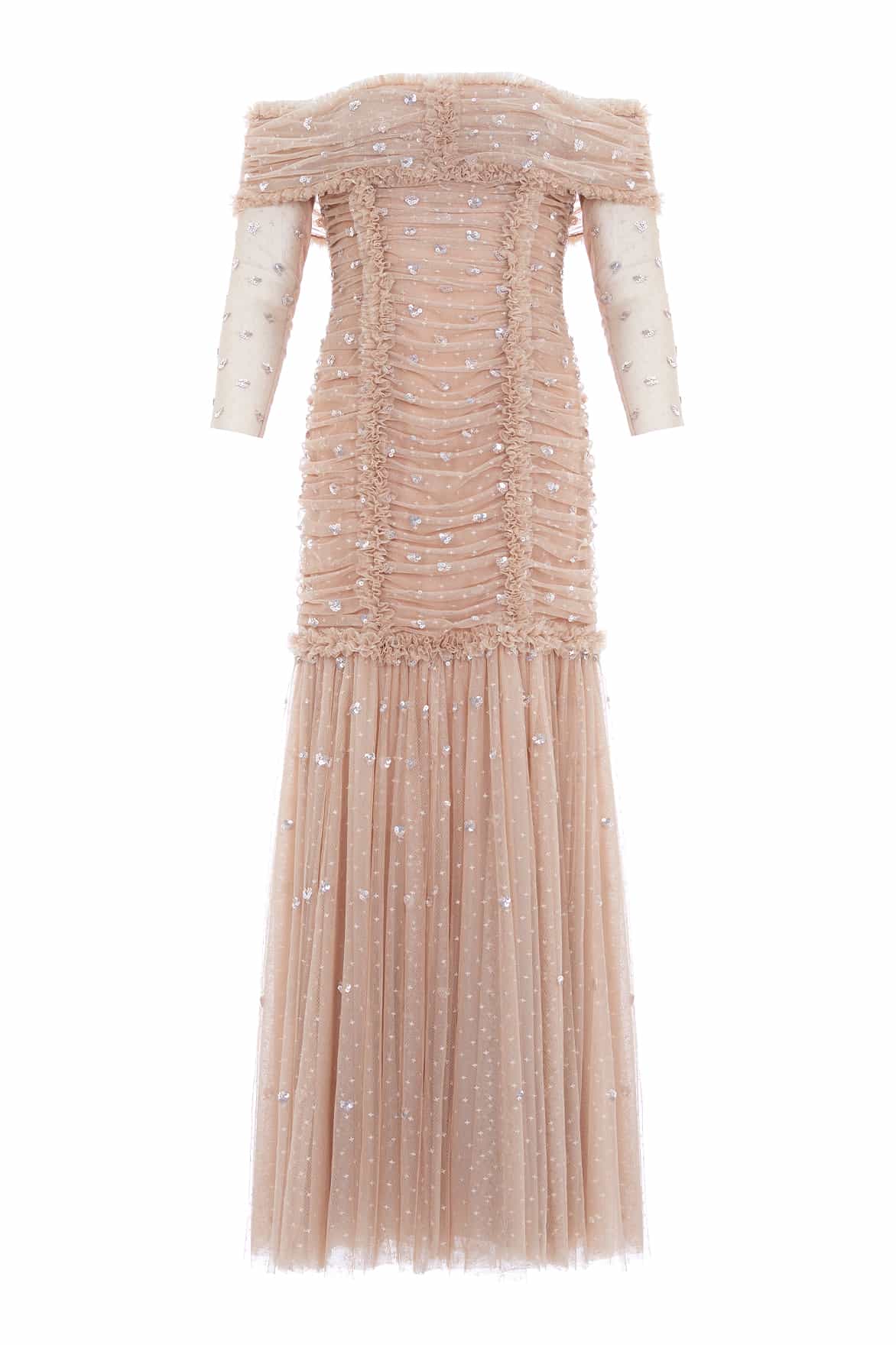 The Love Heart Rouched 0ff-Shoulder Gown in Sand. This gown is decorated with sequins in love-heart motifs creating an all-over shimmering effect. Beautifully designed with a figure hugging silhouette featuring gentle ruching throughout the body to create a flattering effect. Developed in power mesh fabric for stretch and comfort. A season favourite at Needle & Thread HQ.