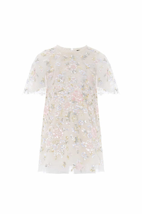 NEW SEASON. The Peony Bouquet Sequin Cape Kids Dress in Cream/Multi. This luxurious kids dress is adorned with tiny shimmering sequins forming romantic garden florals. Finished with a flowing cape detail and softly layered skirt, it creates a magical silhouette. A special occasion style with elegant sparkle.