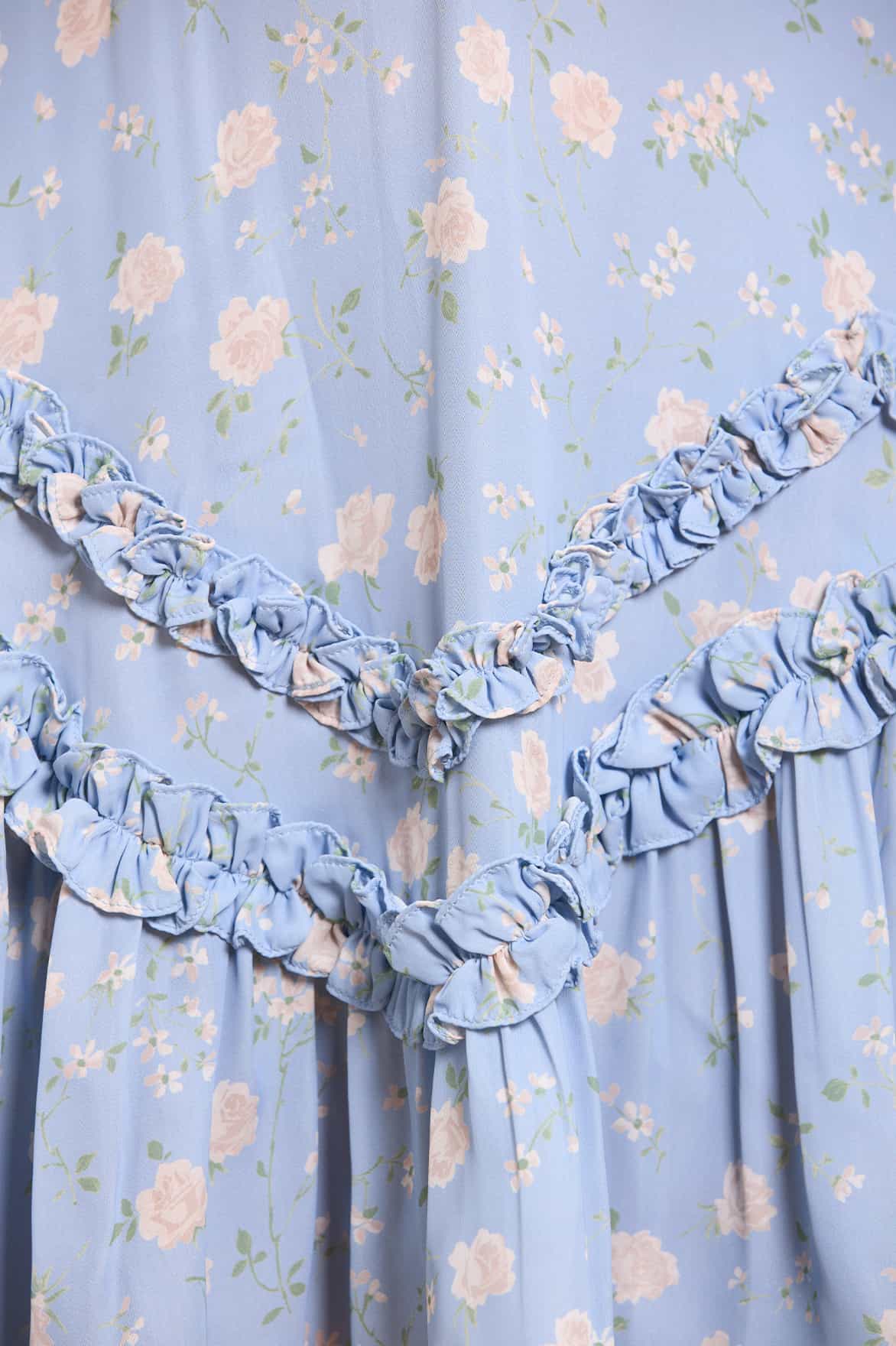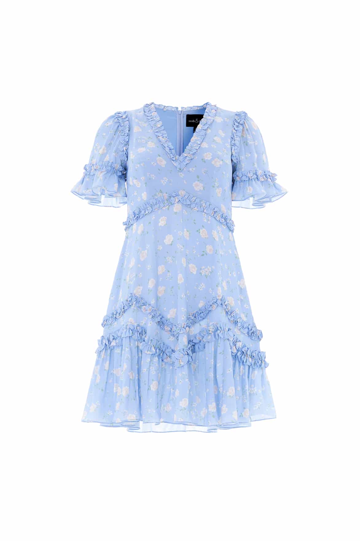 The Rose Ditsy Satin V-Neck Micro Mini Dress in Sky Blue/Cream. This mini dress features a romantic floral print inspired by an 1800s hand-painted wallpaper. Crafted in luxurious satin, it showcases signature Needle & Thread frills at the neckline, shoulders, waist, and cuffs. The fluted sleeves and chevron-edged satin frills on the skirt add a soft, feminine touch. With a flattering V waist seam and slim, graceful silhouette, this dress offers timeless tea dress elegance and charm.