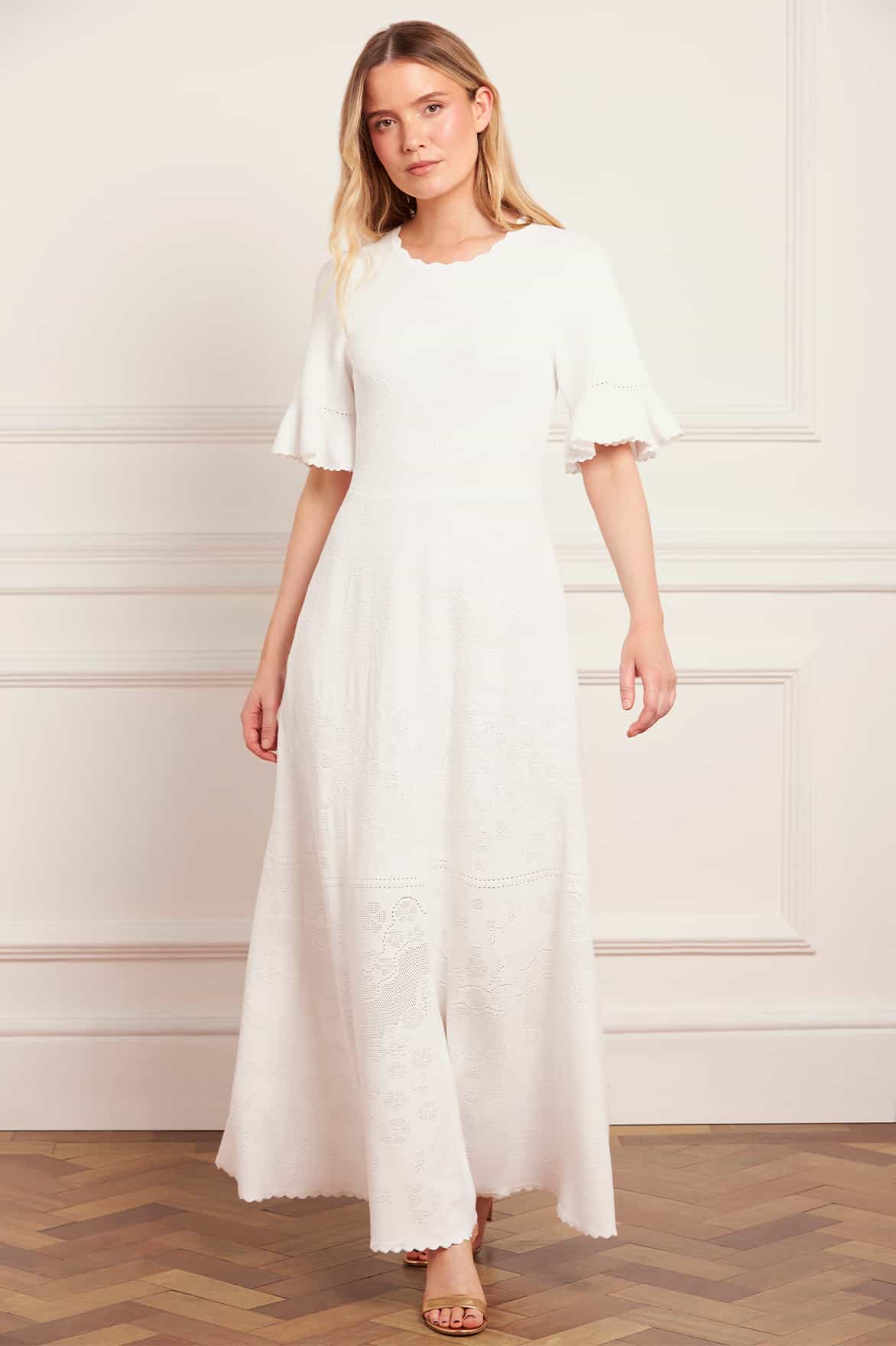 NEW SEASON. The Scallop Lace Pointelle Knit Gown in Cream. A graceful knit design with a scalloped neckline and soft lace detailing. Combining delicate craftsmanship and fluid drape, it offers a modern twist on timeless romance.