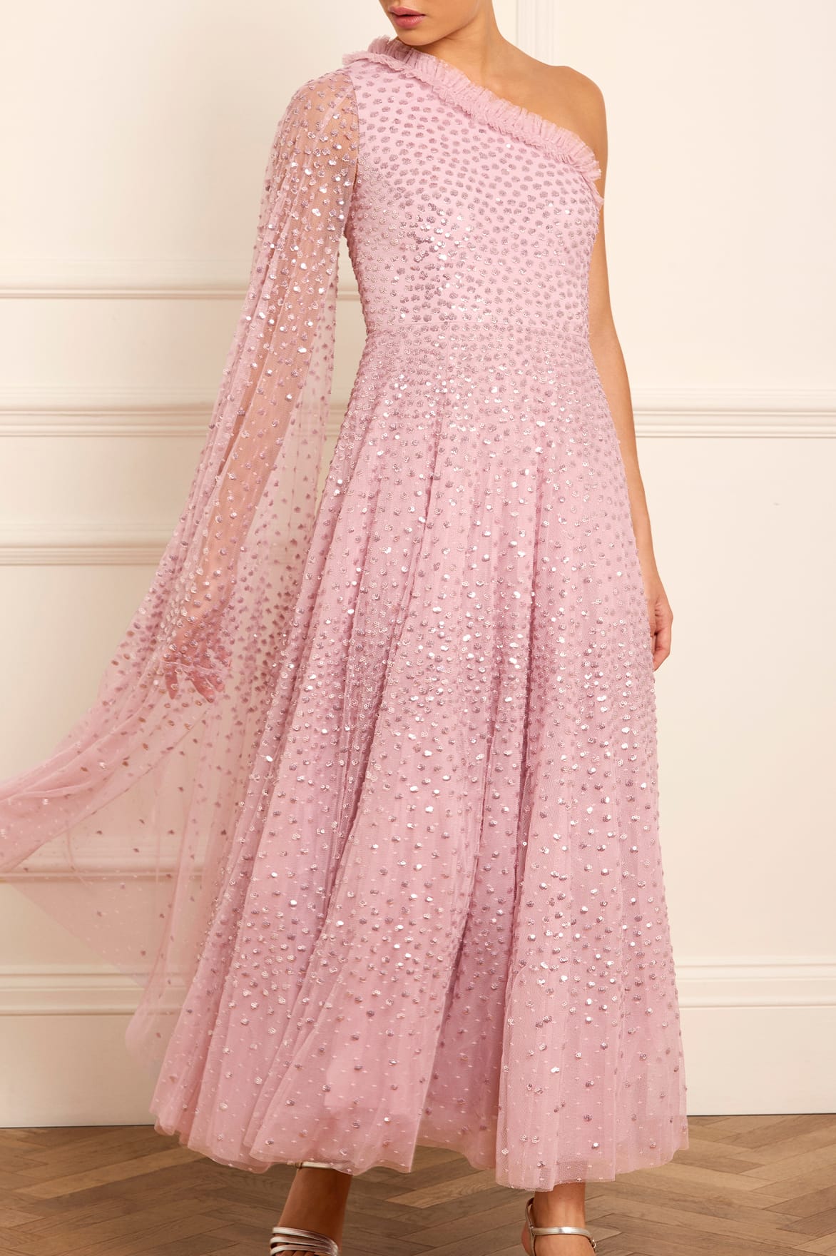The Scatter Dot One-Shoulder Ankle Gown in Misty Lilac. This embellished gown is decorated with exquisite shimmering dot motifs, undulating in wave formations for a captivating glittering effect. This gown features a sweeping floor-length cape sleeve for romantic detailing and a statement look. The flattering one shoulder neckline is trimmed with signature Needle & Thread tulle frills. The skirt is made up of generous layers of net and tulle with sweeping hemline. The perfect gown for an upcoming special occasion.