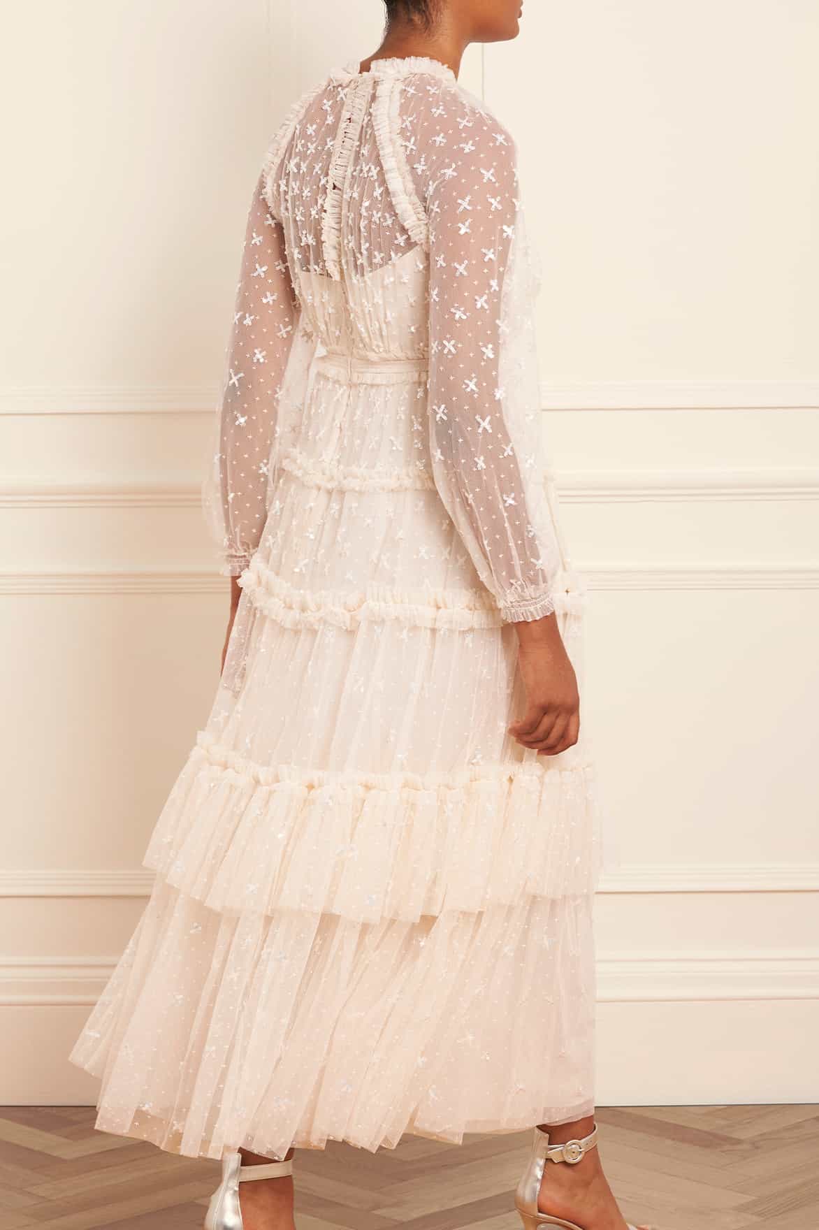 The Sequin Kisses Ankle Gown in Cream. Beautifully adorned with intricate star motifs scattered throughout, creating an enchanting, shimmering effect. This flattering gown is developed with a smocked waist, long sleeves and tulle frill detailing. Designed with elasticated cuffs and a keyhole neckline for an effortless look. The perfect gown for an upcoming special occasion.