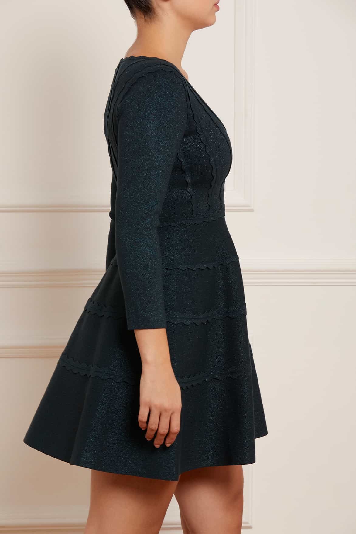 - Knitted stretch viscose dress with metallic fibre, decorated with scallop trims