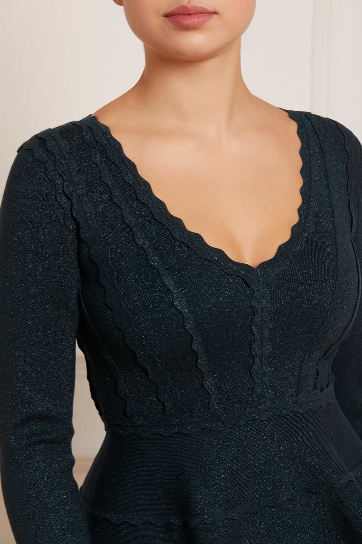 The Shimmer Knit Mini Dress in Emerald. This mini dress is designed with a shimmer knit fabric inspired by vintage textiles. Crafted intricately with knitted scallop trims for signature Needle & Thread detailing. Developed from a responsibly sourced stretch viscose, twisted with tonal lurex for a delicate subtle shimmer. Designed with a fitted bodice and V-neckline for a flattering silhouette. The perfect dress to take you from day to night.