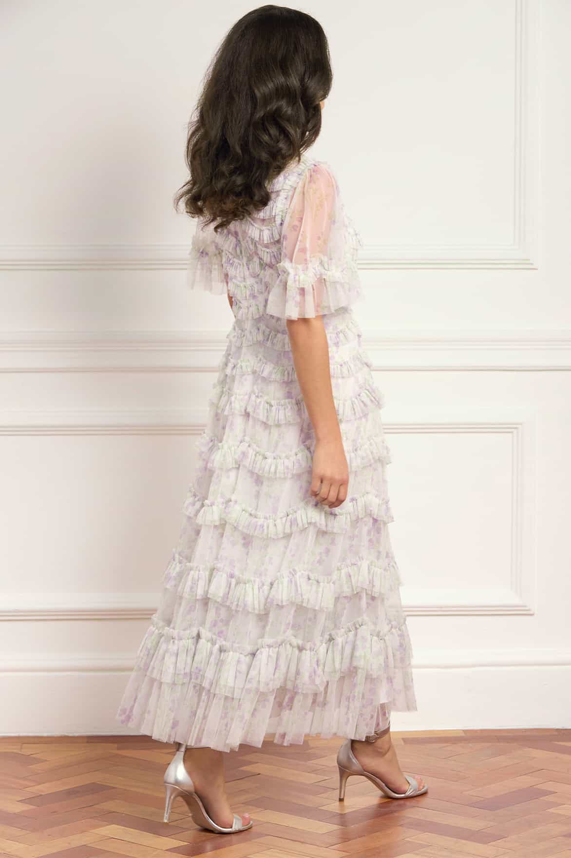 - Floral printed tulle decorated with layers of tulle ruffles.