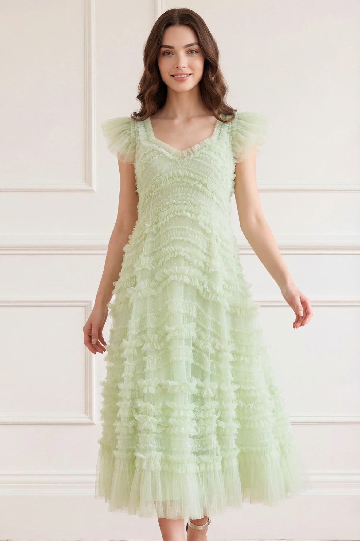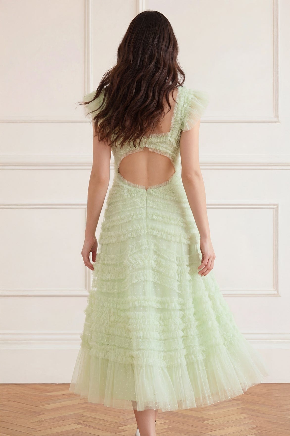 NEW SEASON | NEEDLE & THREAD EXCLUSIVE. The Amara Backless Ballerina Dress in Peppermint. A romantic silhouette featuring flowing ruffle detailing that sweeps across the bodice. Finished with a dramatic open back and layers of soft tulle, the skirt creates elegant volume and fluid movement.