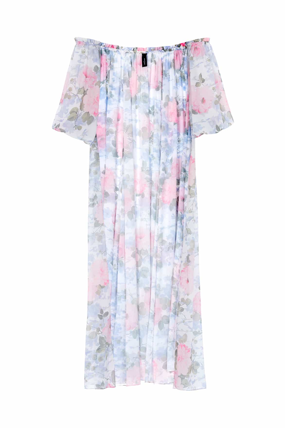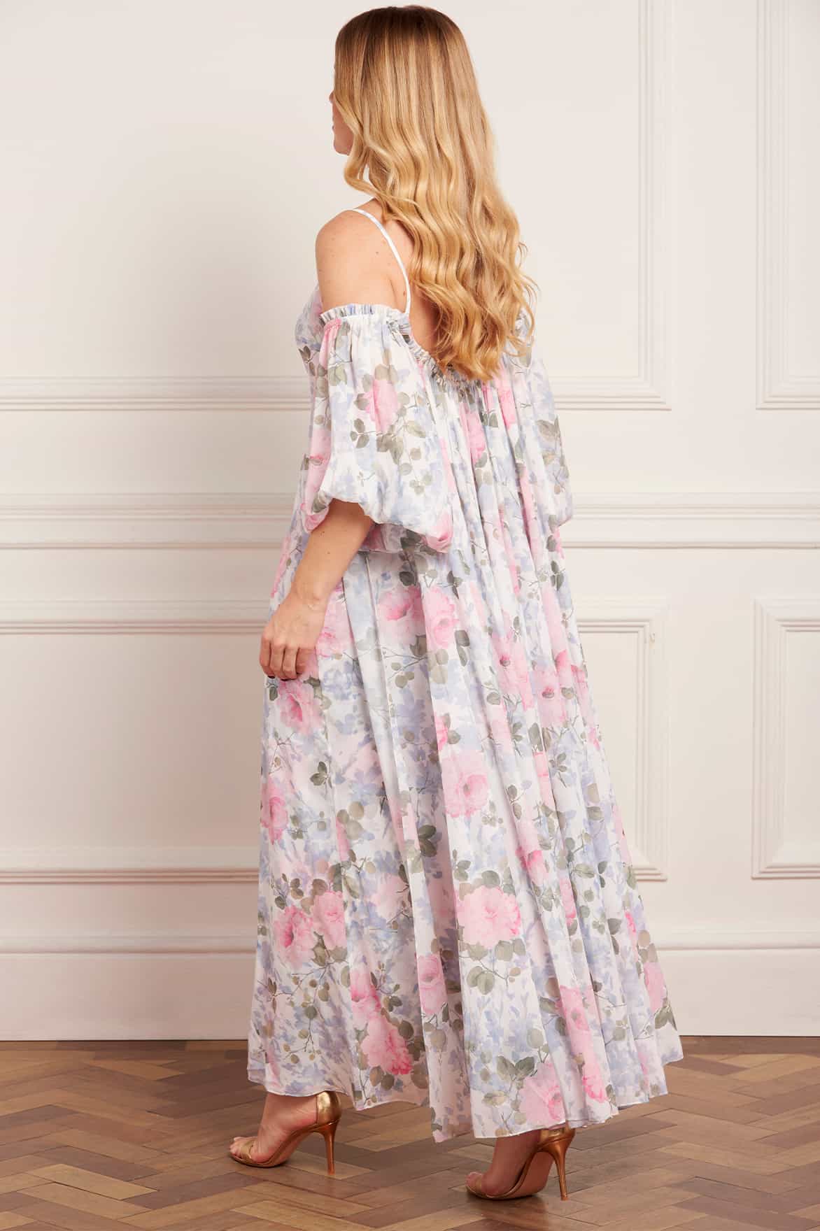 NEW SEASON | NEEDLE & THREAD EXCLUSIVE. The Camille’s Garden Azeline Chiffon Off-Shoulder Cape in Moonshine. Features a delicate floral print inspired by hand-painted artwork from the early 1900s. Designed with an elegant off-shoulder neckline and flowing chiffon cape, this exclusive style exudes effortless romance.