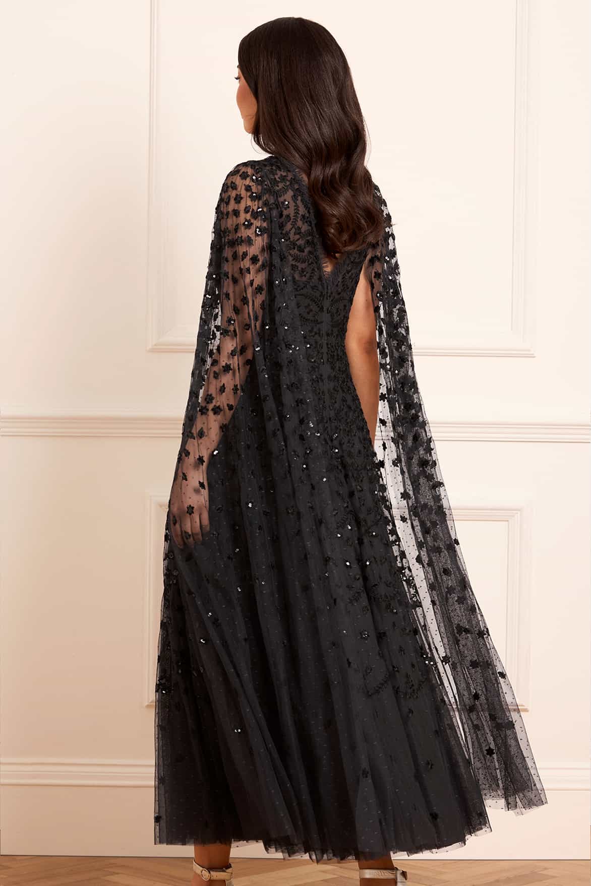 The Clover Cape Sleeve Ankle Gown in Graphite. A romantic silhouette inspired by vintage lace designs from the early 1900s. Adorned with delicately embroidered ditsy florals and scalloped foliage motifs, the gown features soft cape sleeves for an ethereal touch. The embroidery gradually widens toward the hem, dissolving into swirling floral patterns for a soft, whimsical finish. A perfect choice for seasonal events and graceful occasions.