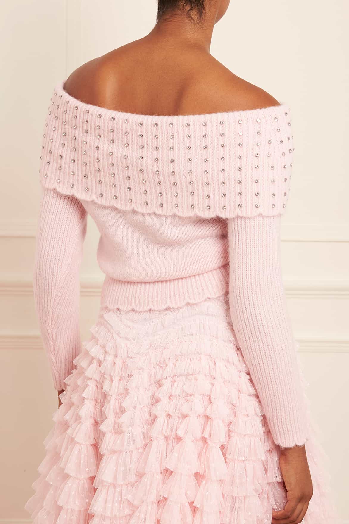 The Embellished Bardot Jumper in Peony Pink. This knitted jumper is developed from alpaca yarn, creating a soft, fluffy texture. Beautifully crafted with an off-the-shoulder bardot design featuring signature Needle & Thread scallop detailing. This jumper has slim-fit ribbed sleeves and a plain knitted bodice, creating a slight blouson silhouette. Beautifully adorned with crystal gems on the bardot neck in a linear pattern for a signature Needle & Thread feminine look. This elegant style is a new season favourite.